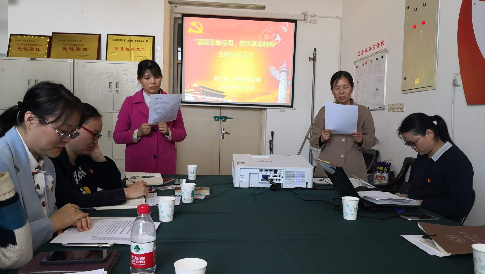 本网讯(文/张超 图/栗彦芳)为扎实做好基层党支部标准化建设,丰富主题党日活动形式,教育引导党员缅怀先烈,抒发爱党爱国情怀,坚定理想信念,传承革命精神,加强党性修养,2019年4月16日下午,研工部、研究生院党支部结合学习安排,在BN911举行“红色经典诗词诵读”主题党日活动。活动由党支部书记蒋时红主持。