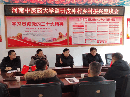 彭新强调,这次代表校党委来慰问调研,一是看望脱贫户,把校党委的关心送到脱贫户家中,向群众送去党的温暖,同时看望驻村工作队员,解决大家在生活、工作中的困难。二是走访交流,进一步了解前期驻村工作情况和下一步工作思路。通过走访察看和听取汇报,帮扶工作成效显著,下一步要持续发力,大胆工作,学校党委是大家的坚强后盾。三是把学校的资源优势与皮冲村优质资源精准对接,充分利用学校中医药教育、科研、人才、医疗资源优势,发挥好中药学人才作用,指导好皮冲村中药材种植,促进中药材产业发展;通过送医送药下乡义诊、中医药知识宣传、中医适宜技术推广等,为皮冲村乡亲提供专业、优质的医疗服务和健康知识普及,为村民的健康保驾护航;通过消费帮扶,引导全校教职工购买皮冲村绿色有机食品、绿茶等高质量的农副产品,拓展销售渠道,增加农户收入,助推和美乡村建设,为全面推进乡村振兴贡献力量。