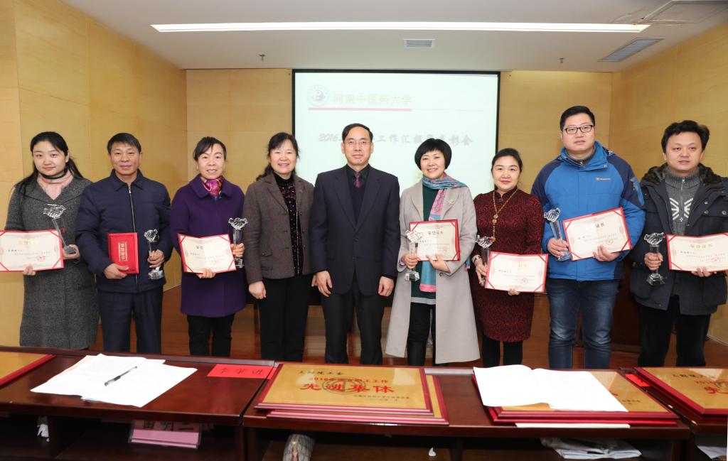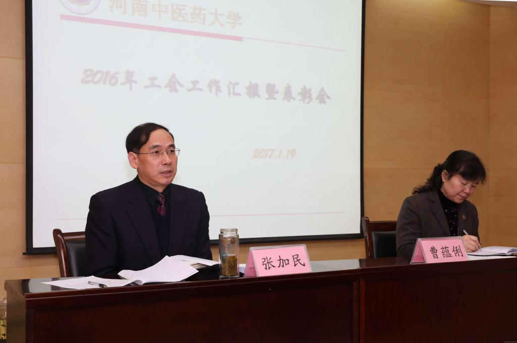 工会副主席曹蕴俐同志首先代表校工会汇报了2016年的工作,她从落实从严治党、“两学一做”学习教育、工会作风建设、廉政建设、师德师风建设、“劳模创新工作室”创建、依法治会、坚持教代会制度、开展岗位技能比武、中医传统诊疗技术展示、主动维权,积极为教职工排忧解难、创新经费使用模式,广泛开展教职工喜闻乐见的活动、依托协会搭建各类工作和活动平台、女职工、计划生育、红十字志愿服务工作等方面进行了总结汇报。工会主席张加民先后为获得“工会工作先进集体”、“师德师风建设先进集体”、“女职工工作先进集体”、“文体工作先进集体”、“优秀协会”、“优秀工会干部”、 “优秀女职工工作者”和获得学校首届“最美家庭”的代表颁发了奖状和奖杯并对他们表示了祝贺和鼓励。