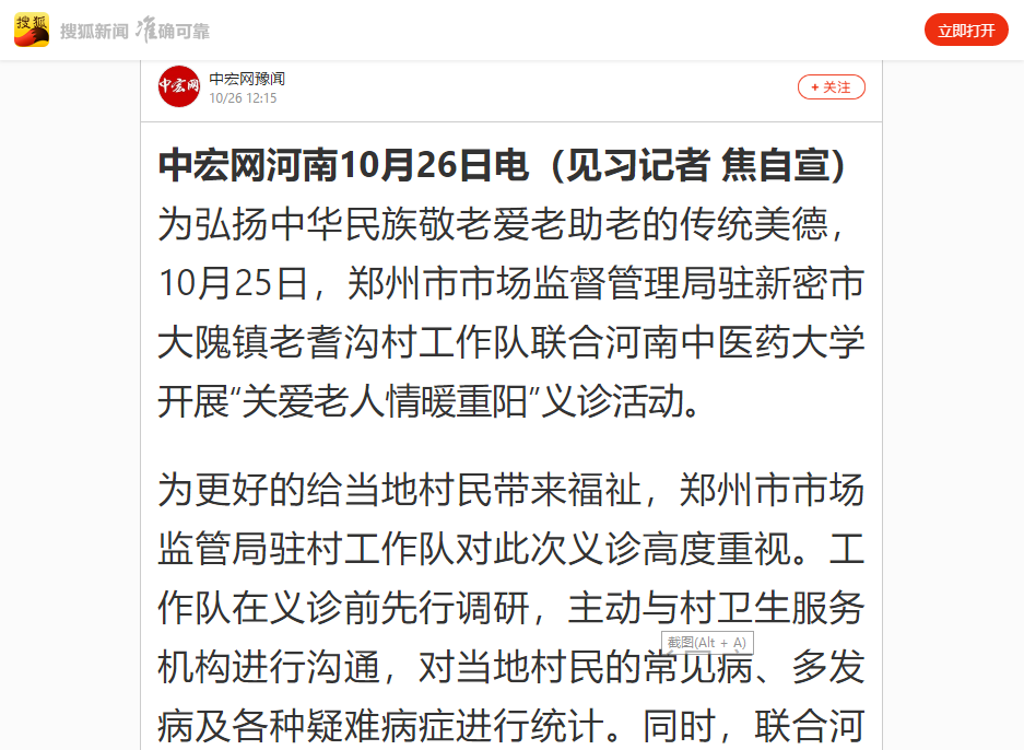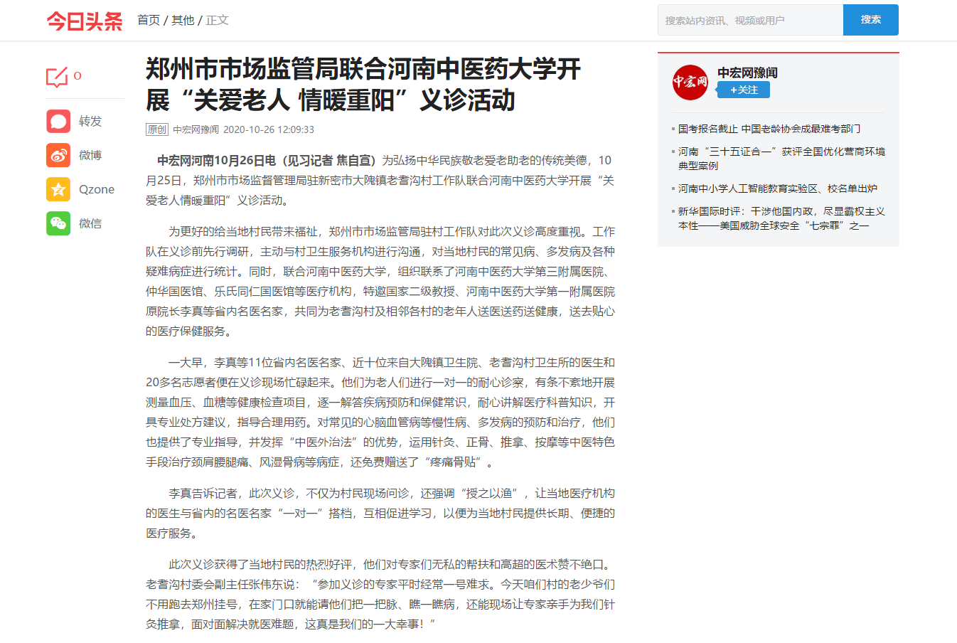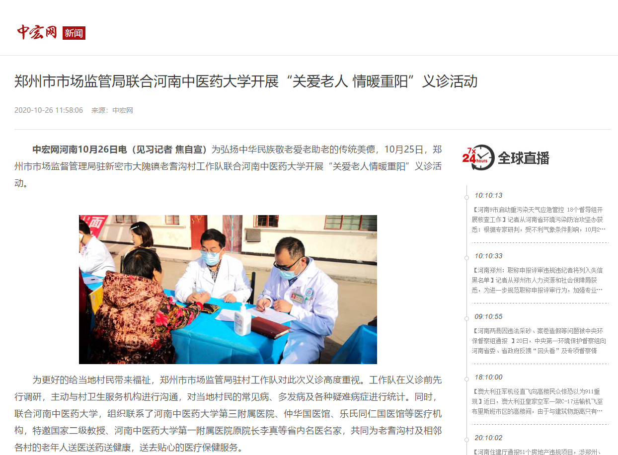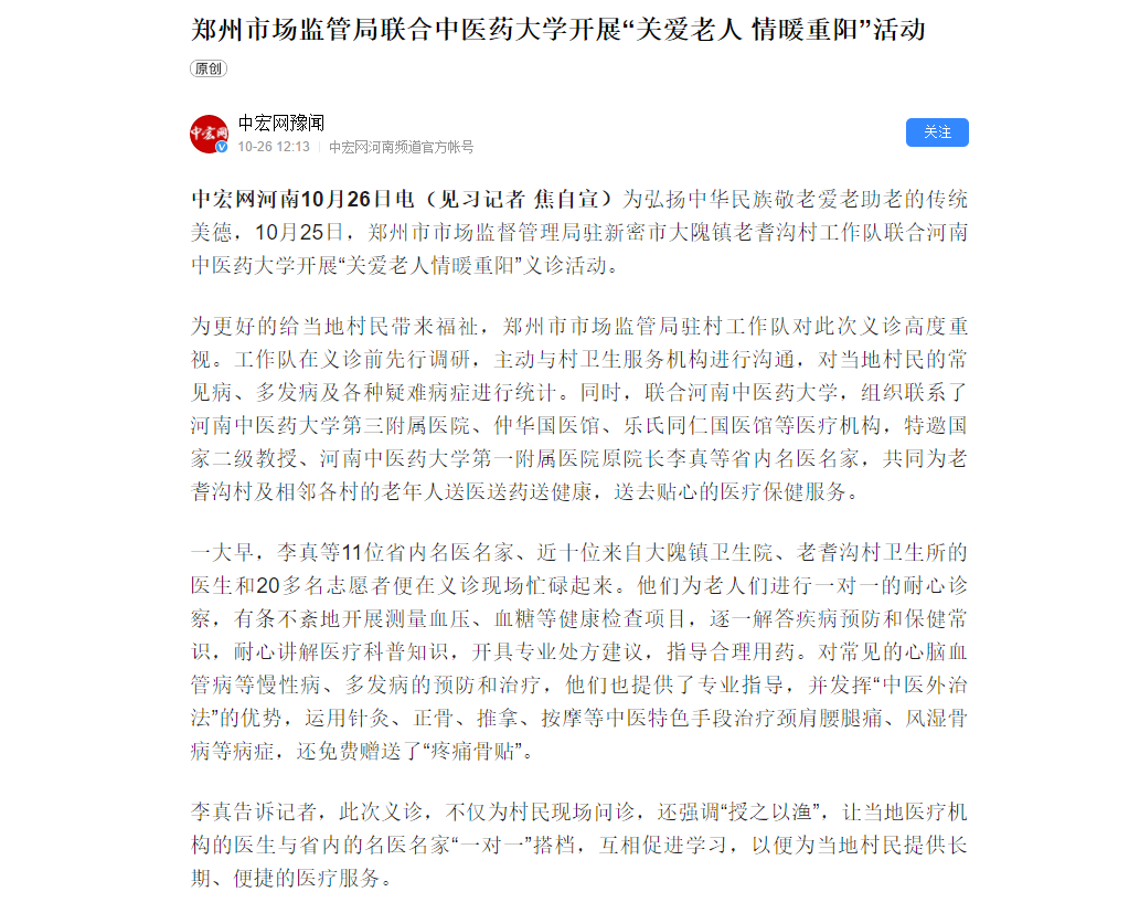 编者按:2020年10月26日,中宏网、今日头条、中宏网豫闻、搜狐新闻等媒体对郑州市市场监管局联合leyu·乐鱼(中国)体育官方网站开展“关爱老人 情暖重阳”义诊活动进行报道。
