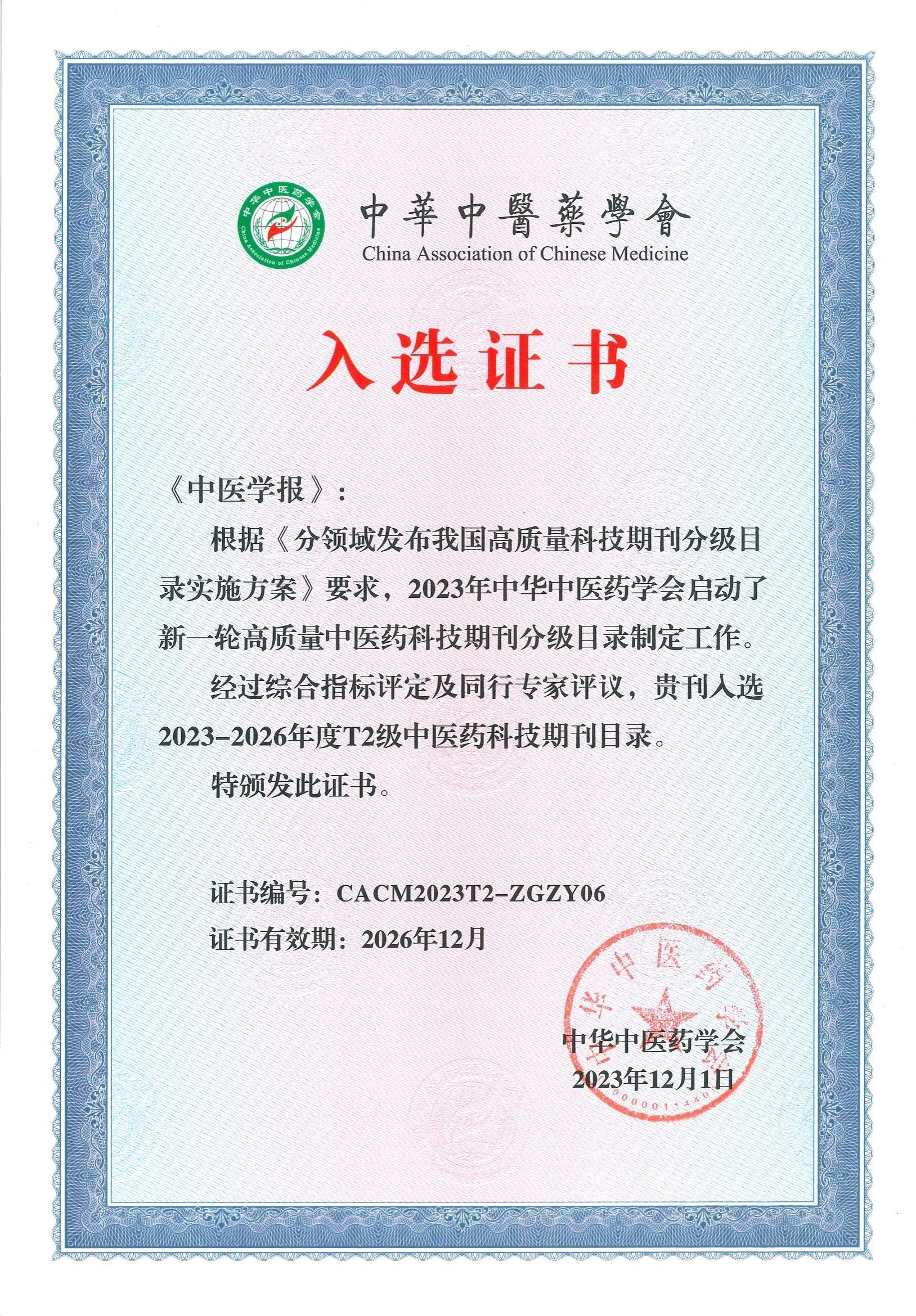 近年来,《中医学报》坚持社会效益优先的原则,走高品质、特色化的内涵式发展之路,认真落实党和国家的出版方针、政策和各项管理规定,把握正确出版导向,优化期刊出版结构,在广大读者、作者中享有较高美誉度。《中医学报》将以此次入选T2级中医药中文科技期刊分级目录为契机,进一步提升期刊学术质量和学术影响力,继续打造好中医药传承、创新的学术平台,努力争创一流的中医药学术期刊。
