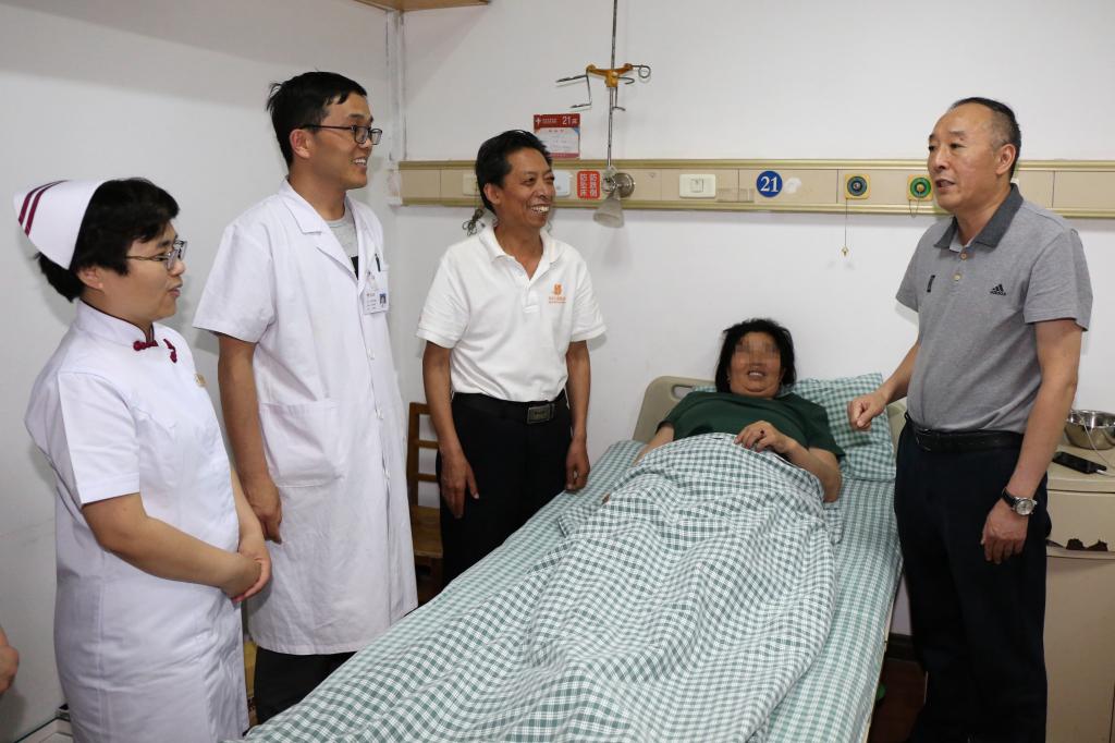 本网讯(文图/廉万营)2019年6月3日,二附院副院长郑福增来到住院部,代表医院看望、慰问在此陪护家属的2018“河南最美教师”张锦文,并鼓励患者增强信心,安心治病。