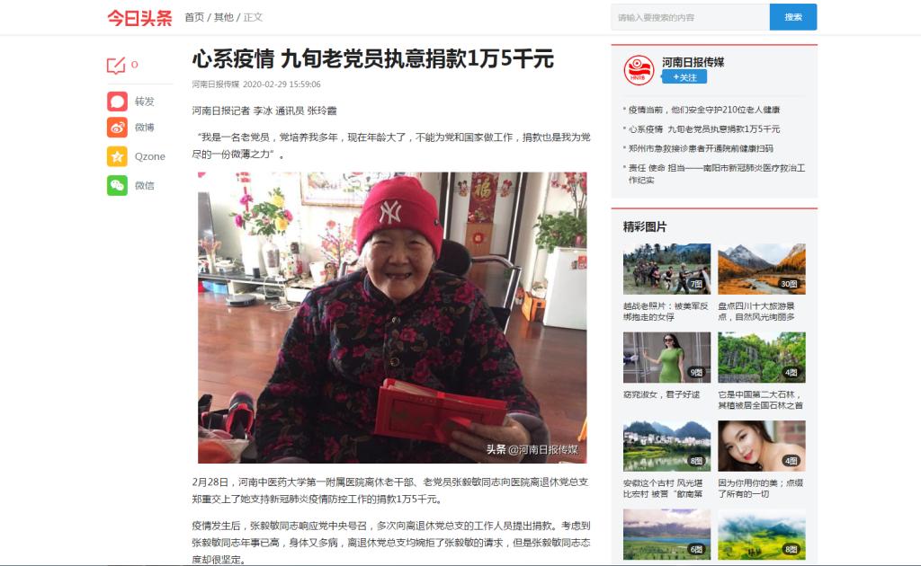 编者按:2020年2月29日,河南日报传媒对leyu·乐鱼(中国)体育官方网站一附院离休老干部、老党员张毅敏同志向医院离退休党总支捐献爱心进行报道。现将全文刊发如下: