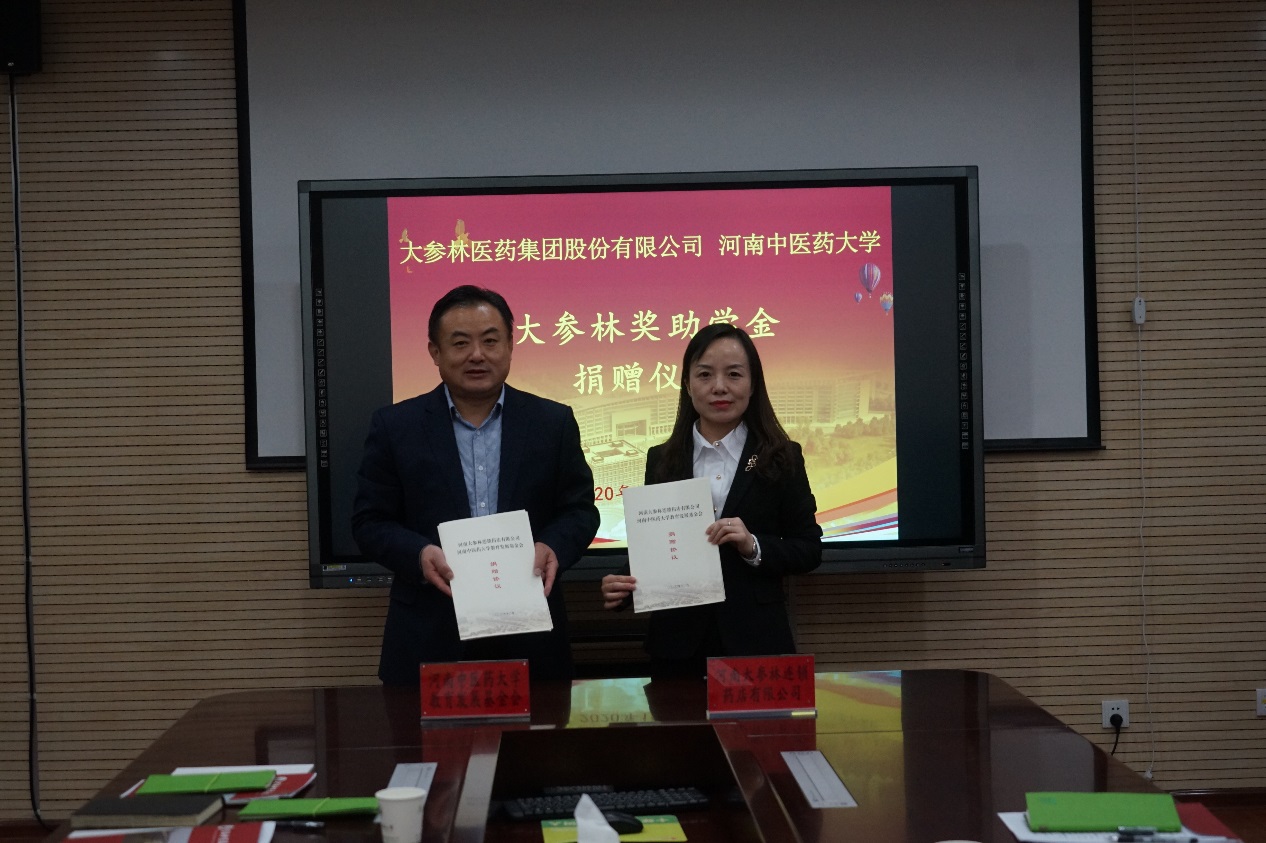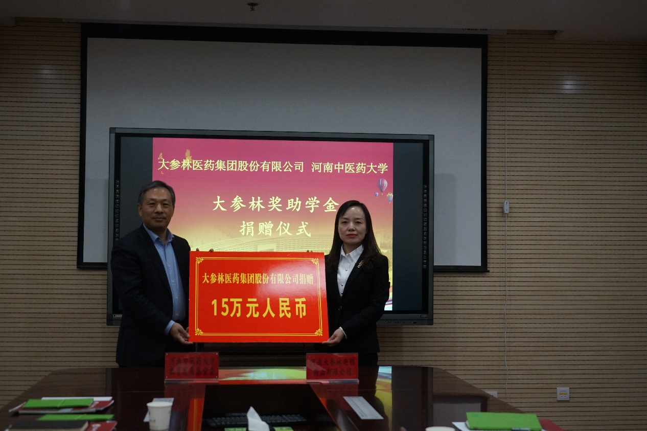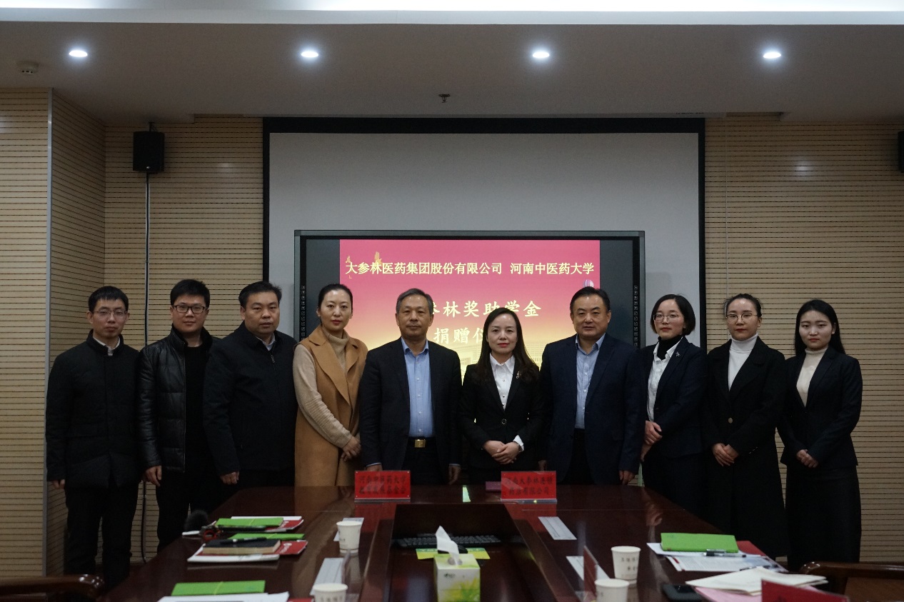 本网讯(文/图 高巍)2020年12月23日上午,"大参林奖助学金"捐赠仪式在教学实验大楼BS705会议室举行。大参林医药集团股份有限公司河南大区人力资源部经理董杰,校党委委员、副校长徐江雁出席会议,大参林医药集团和学校相关部门负责同志及药学院班子成员参加仪式。仪式由药学院院长朱建光主持。