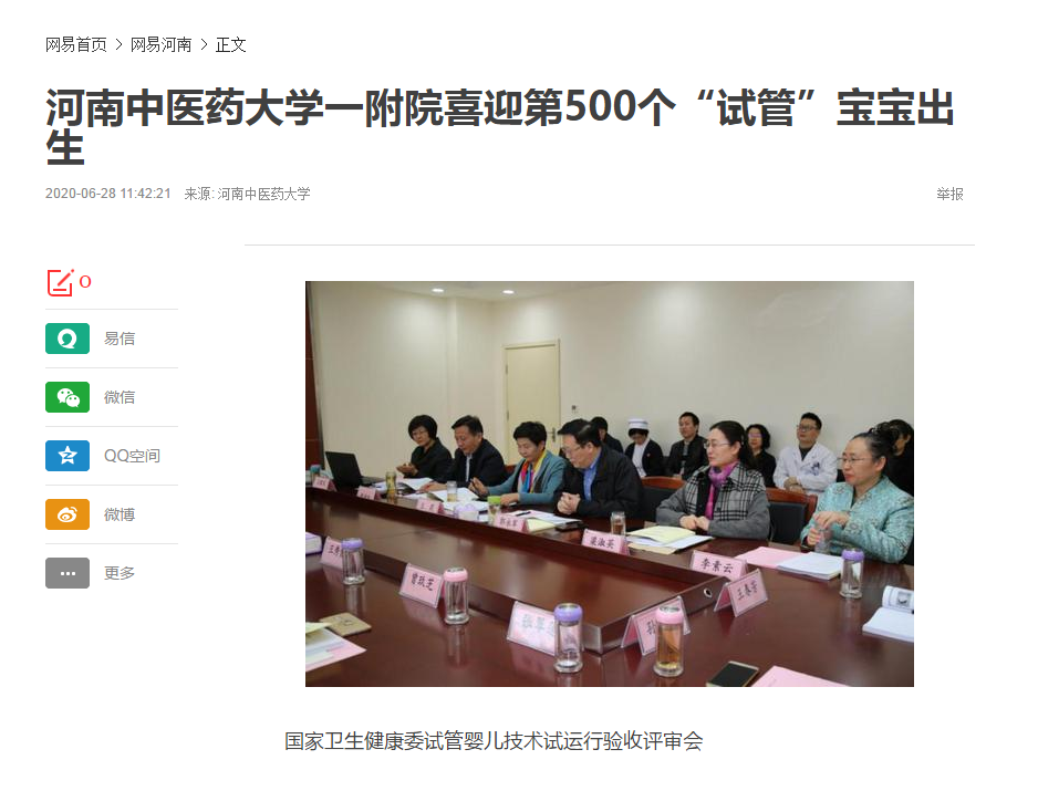 2020年6月28日,大河网、网易新闻对leyu·乐鱼(中国)体育官方网站一附院喜迎第500个“试管”宝宝出生进行报道。