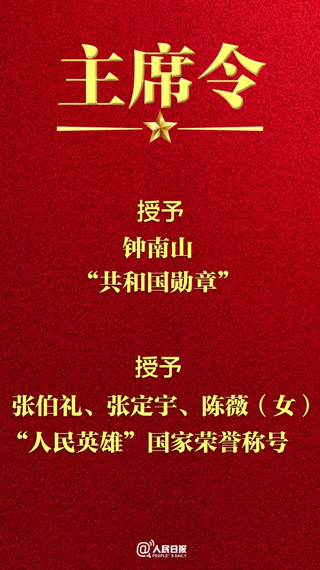 二、授予张伯礼、张定宇、陈薇(女)“人民英雄”国家荣誉称号。