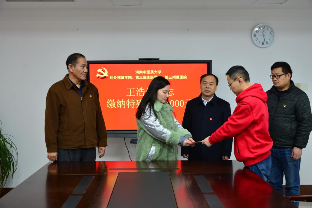 本网讯(文/祝珍珍 图/潘向昆)2020年1月8日,三附院举行了一场特殊的仪式——三附院学生、中共预备党员王浩然同志交纳特殊党费。