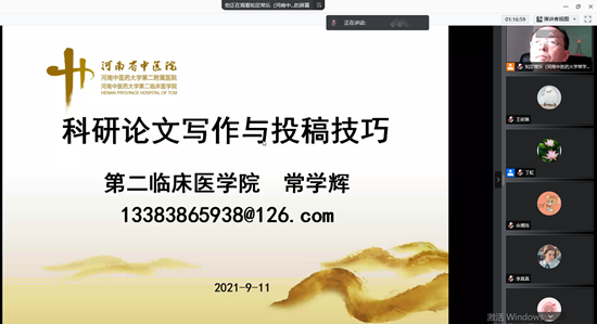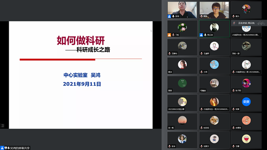 博士生导师吴鸿是河南省中医药学会心血管专业委员会委员,主持多项国家自然科学基金课题,发表中文核心和SCI论文多篇。11日晚,他以自身经历为起点向同学们讲述了如何从科研小白成长为高质量写作者与科研工作者,并就科学研究的五个重要环节展开讲述,指出科学研究是个循序渐进的过程,在科研成长的道路上也是如此,希望同学们在这条道路上不畏惧失败,不要怕“丢脸”,面对困难和挑战,不逃避不放弃,埋头苦干,终究会通过自己的努力从科研小白发生质的蜕变,并寄语同学们:科研的道路注定布满荆棘,唯有坚守本心,方可从一而终,并祝同学们今后的科研生涯前程似锦,“长风破浪会有时,直挂云帆济沧海”。