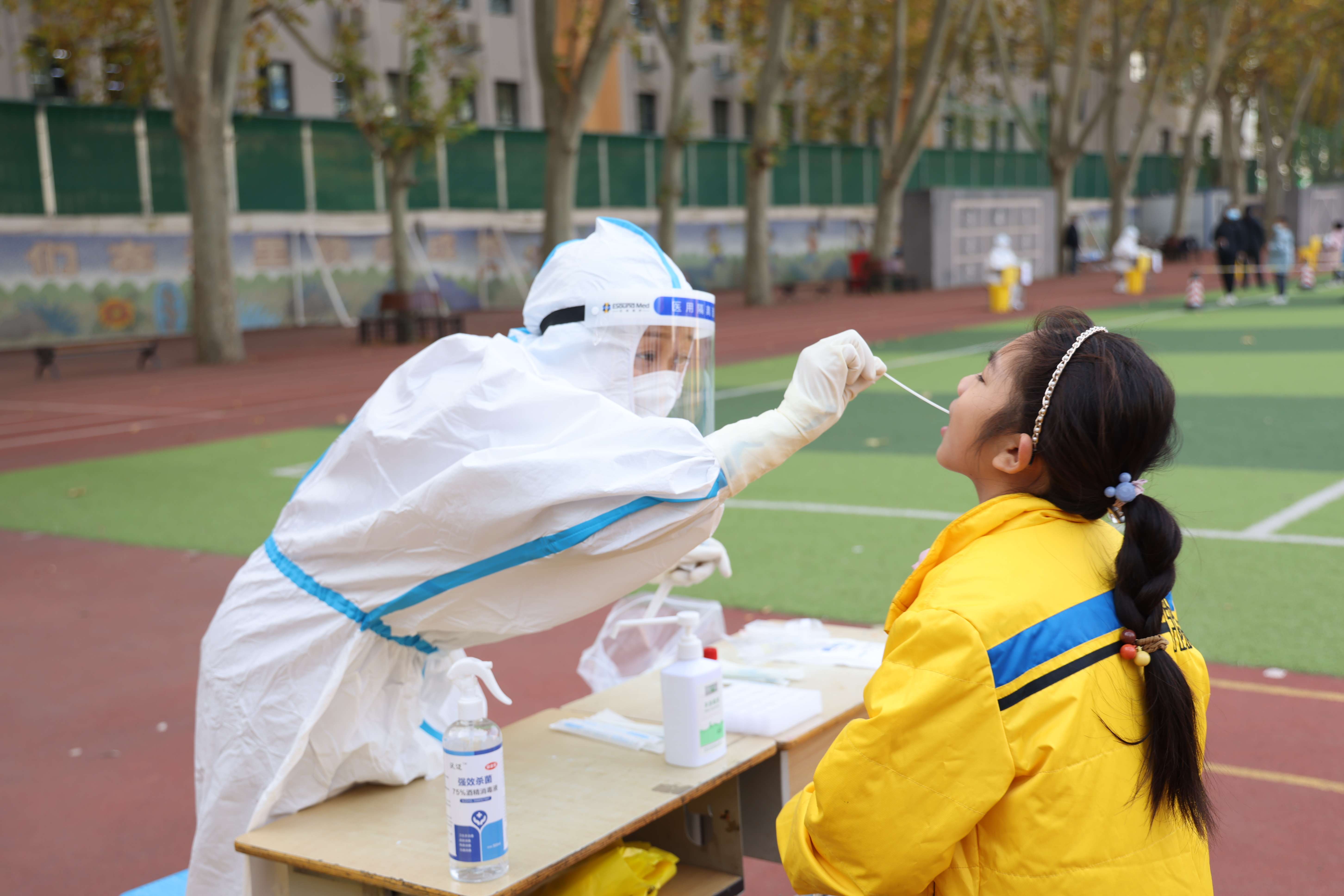 “小朋友,你不要紧张,张大嘴巴,啊!”在三附院核酸采样点金水区金桥学校,同学们分班有序进入检测场地,间隔1米列队等候,骨伤科主管护士李春平一边耐心安抚小朋友,一边迅速拿起棉签轻轻在口腔内擦拭,采样动作轻柔、迅速、精准。在这个核酸采样点,她和队员们要为近3600名全校师生完成核酸采集工作,因为小朋友身高有高有低,她干脆站起来猫着腰完成采集工作,持续一上午的高强度检测任务,当问起累不累的时候,她说,小朋友们一句“谢谢您,医生,您辛苦了”并弯腰向我鞠躬致谢的情形就让疲惫烟消云散,心里充满了温暖和感动。