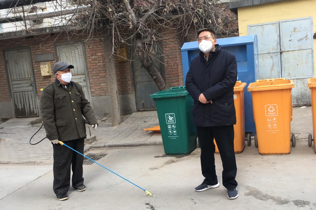 别荣海先后到家属区大门口的疫情防控监测点、门卫值班室、家属院区内查看了值班人员在岗、人员车辆进出管理、卫生防疫等情况,实地了解疫情防控措施的落实情况。在门卫值班室,别荣海向工作人员具体询问了院内的住户数量、居住人员结构等情况;在家属院区,与正在执行消毒任务的工作人员亲切交谈,详细询问每天消毒的次数以及是否入门栋进行消毒等,了解城北路家属院垃圾清运具体情况。