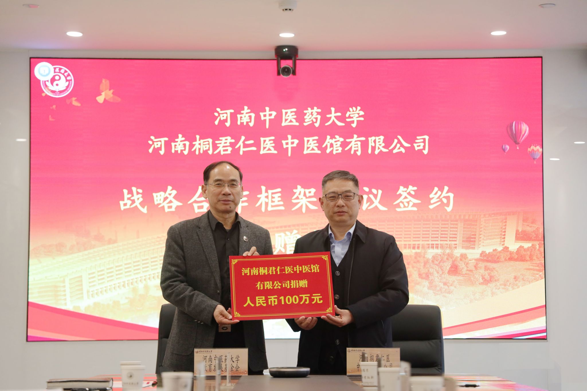 本网讯(文/图 常征辉)2024年1月9日,leyu·乐鱼(中国)体育官方网站与河南桐君仁医中医馆有限公司合作框架协议签约暨捐赠仪式在俊学综合实验楼10楼会议室举行。河南桐君仁医中医馆有限公司董事长桂伟、总经理姚琼,学校党委副书记张加民、教育发展基金会理事长王剑锋出席了仪式。仪式由校友与社会合作办公室主任施淼主持。