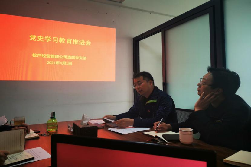 本网讯(文/周伟 图/贾姝)为扎实开展好党史学习教育,2021年4月1日下午,校产经营管理公司直属党支部在党员活动室召开了党史学习教育推进会。公司党员和科级以上干部参加会议,会议由党支部书记叶险峰主持。