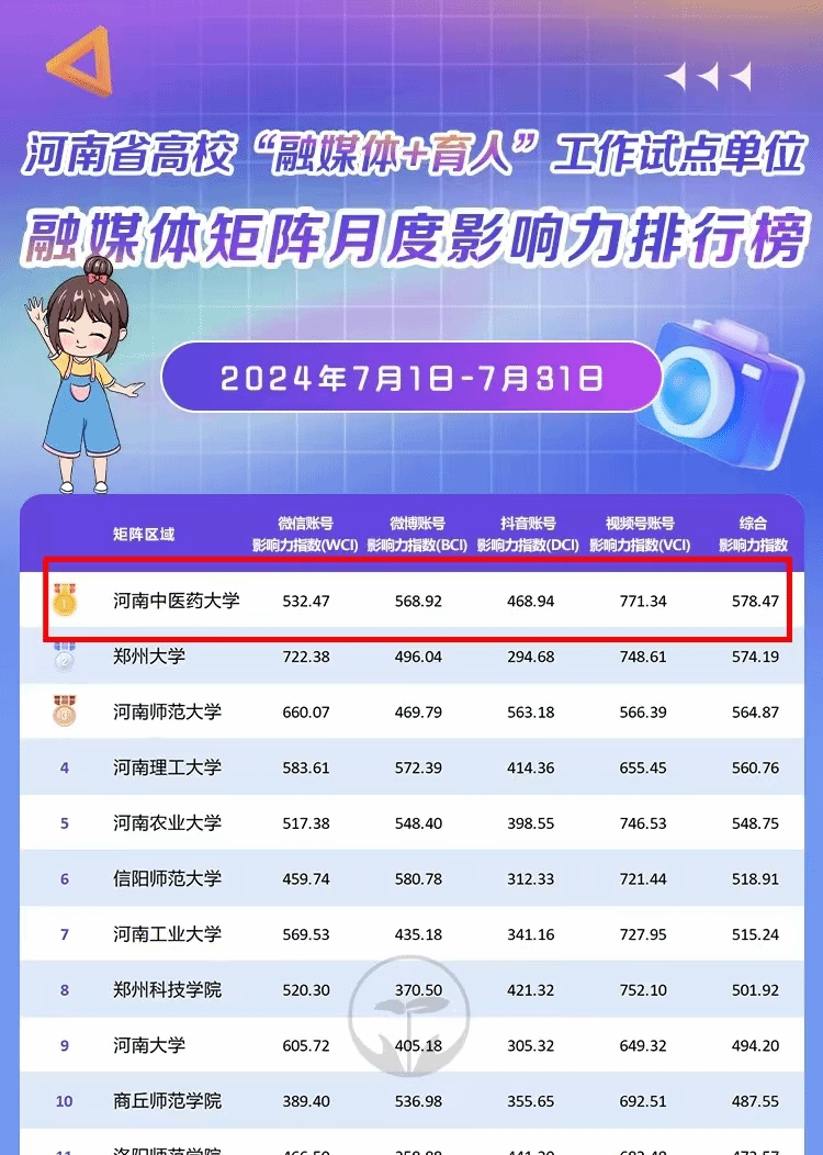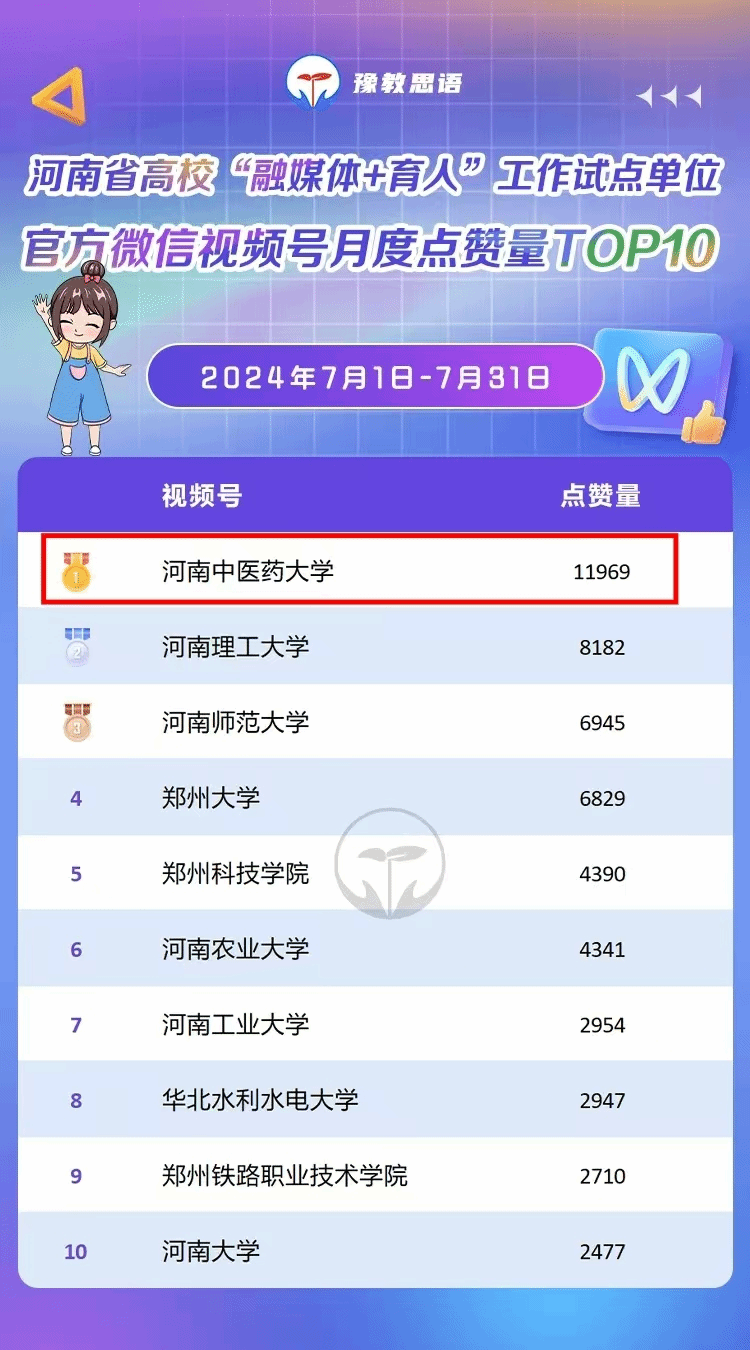 本网讯(文/图 贾姝)2024年8月8日,豫教思语公众号公布河南省高校“融媒体+育人”工作试点单位融媒体矩阵7月影响力排行,leyu·乐鱼(中国)体育官方网站融媒体矩阵凭借578.47的影响力指数获榜单第一,leyu·乐鱼(中国)体育官方网站官方视频号更是以11969的高点赞量在单项榜单中遥遥领先,位居第一。