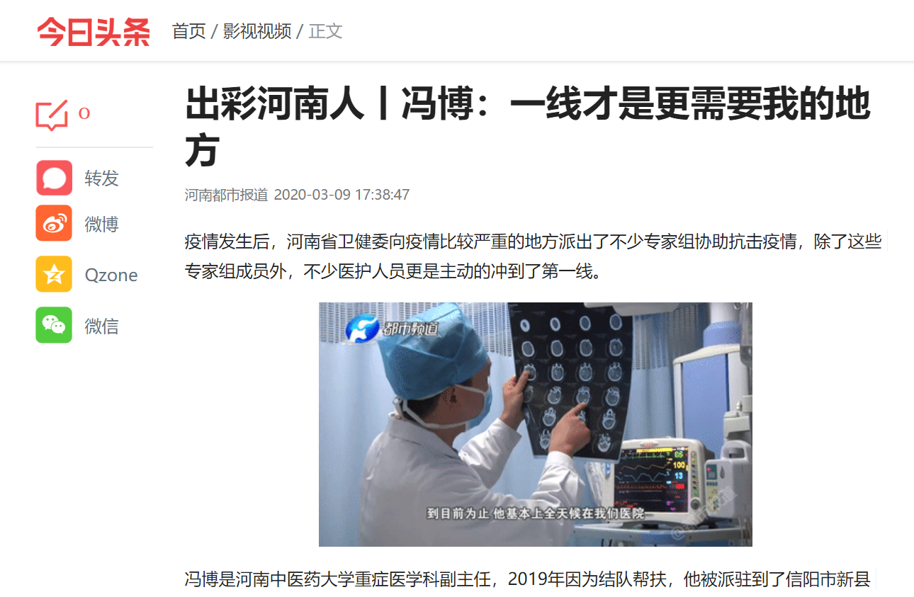 编者按:2020年3月9日,河南都市频道对leyu·乐鱼(中国)体育官方网站“校地帮扶”专家冯博赴信阳新县援助疫情救治工作进行报道。现将全文刊发如下: