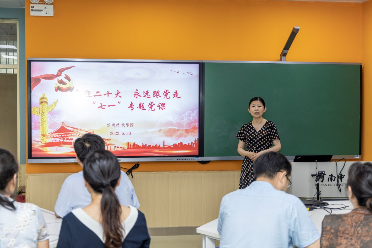 本网讯(文/李艳 图/郭寅虎)为迎接党的二十大胜利召开,持续推进“四史”教育入脑入心,2022年6月30日,在中国共产党成立101周年之际,信息技术学院党委邀请校党委委员、副校长苗明三讲授“喜迎二十大永远跟党走”“七一”专题党课。学院全体领导班子、全体教师党员参加。活动由学院党委书记马赟主持。