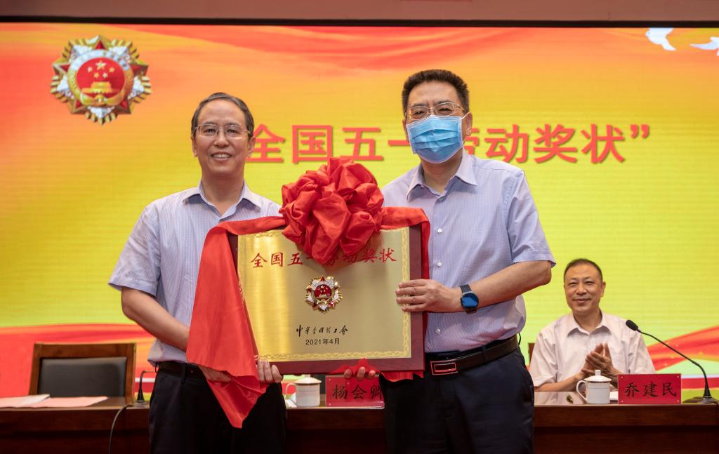 授牌仪式上,乔建民宣读了中华全国总工会《关于表彰2021年全国五一劳动奖和全国工人先锋号的决定》;杨会卿为leyu·乐鱼(中国)体育官方网站颁发“全国五一劳动奖状”,并代表省总工会向leyu·乐鱼(中国)体育官方网站表示热烈祝贺,向leyu·乐鱼(中国)体育官方网站全体教职工致以教师节问候和美好祝福,向一直以来关心支持工会工作的学校领导和广大教职工以及多年来为工会工作做出贡献的广大工会干部表示衷心的感谢。