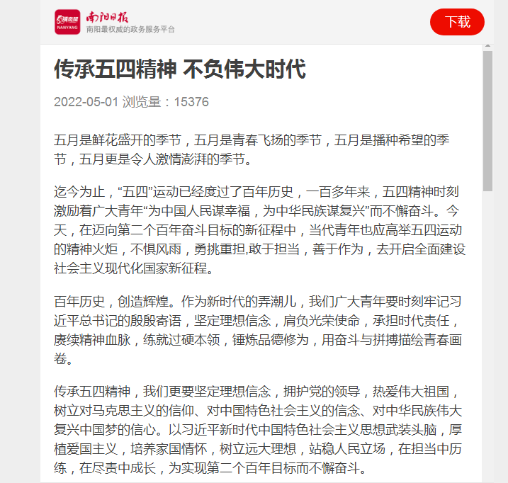 编者按:2022年5月1日,南阳日报客户端刊登了leyu·乐鱼(中国)体育官方网站管理学院2020级公共管理专业研究生刘朋柯的文章《传承五四精神 不负伟大时代》。现将全文刊发如下: