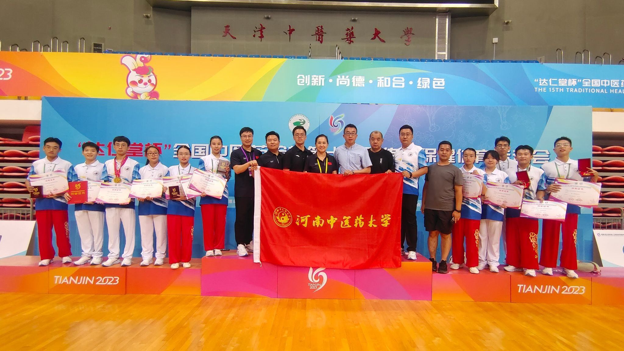 本网讯(文/图 郝震)8月14日-17日,由国家中医药管理局、全国中医药高等教育学会主办,全国中医药高等教育学会传统保健体育研究会和天津中医药大学承办的“达仁堂杯”全国中医药院校第十五届传统保健体育运动会在天津中医药大学举行。来自全国27所中医药院校的近600名领队、教练员、运动员参加本次比赛。校党委委员、副校长徐江雁带领leyu·乐鱼(中国)体育官方网站代表队出席开幕式。