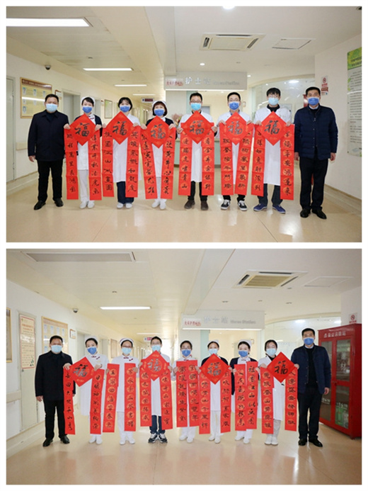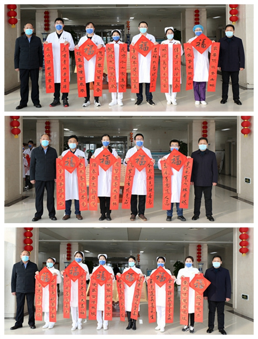 二附院党委书记王海亮、工会主席李希民依次慰问了新冠肺炎定点救治医疗队成员、参与核酸检测的医护人员、临床一线医护人员、职能部门职工代表等,将一幅幅蕴含美好祝福、寓意吉祥、墨香满溢的春联送到大家手上,送上新春祝福的同时,还向医务人员传递了关爱和温暖。