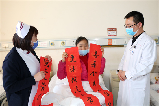 李希民和书画协会的同志还来到部分病区,为临床一线的医护人员及住院患者、家属送上春联,祝愿他们早日康复,欢欢喜喜回家过年。
