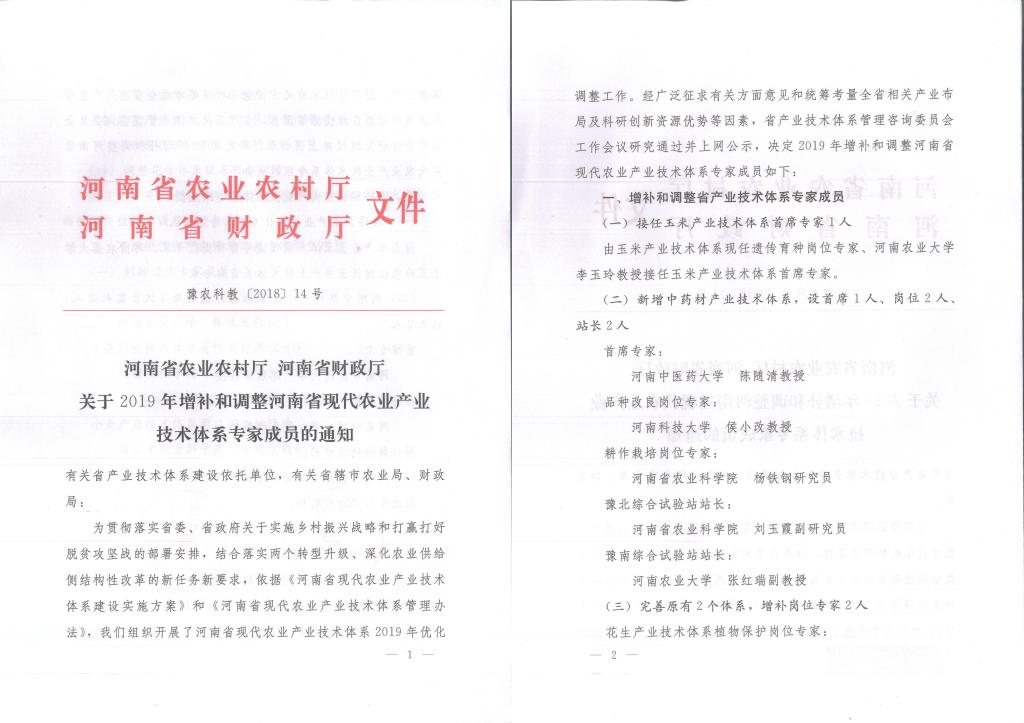河南省现代农业产业技术体系由河南省农业厅和河南省财政厅牵头组建,现由大宗蔬菜、淡水鱼、生猪、玉米、肉牛、花生和中药材等12个体系组成。该体系依托我省现有农业科研力量与科研资源,围绕河南省农业产业发展需求,服务地方经济发展目标。近年来leyu·乐鱼(中国)体育官方网站药学院在河南省道地大宗药材产业研究方面做了大量工作,取得了一批研究成果,培养了一批技术骨干,为河南省中药材产业的发展提供了强大技术保障,得到了河南省相关部门的高度认可。
