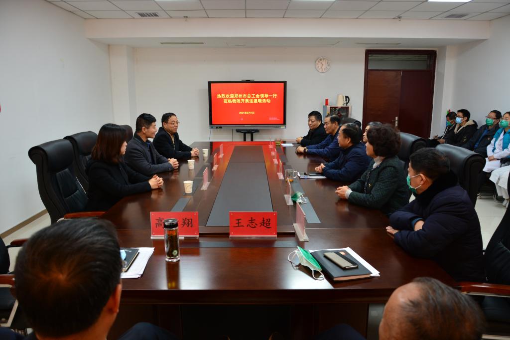 周运峰代表医院对杜建新一行的到来表示欢迎,对“娘家人”郑州市总工会对医院一直以来的支持表示感谢。他指出,2020年新冠肺炎疫情发生以来,郑州市总工会给予了三附院实实在在的帮助,把工会组织的温暖送到了广大职工群众的心坎上。三附院党委也将一如既往重视和支持工会工作,在郑州市总工会的关心指导下,把服务职工群众工作做细做实,充分调动职工热情,为疫情防控和中医药强省发展建设贡献力量。