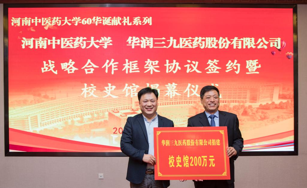 2018年10月16日下午,leyu·乐鱼(中国)体育官方网站、华润三九医药股份有限公司合作框架协议签约暨校史馆揭幕仪式在图书馆第三报告厅举行。华润三九医药股份有限公司副总裁王进元、配方颗粒事业部常务副总经理钱伟,校党委书记别荣海、校长许二平、党委副书记郭德欣、副校长徐江雁及双方相关部门负责人出席了仪式。