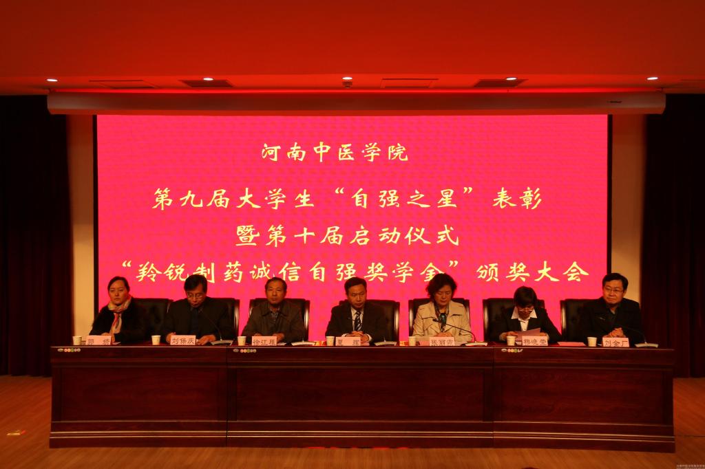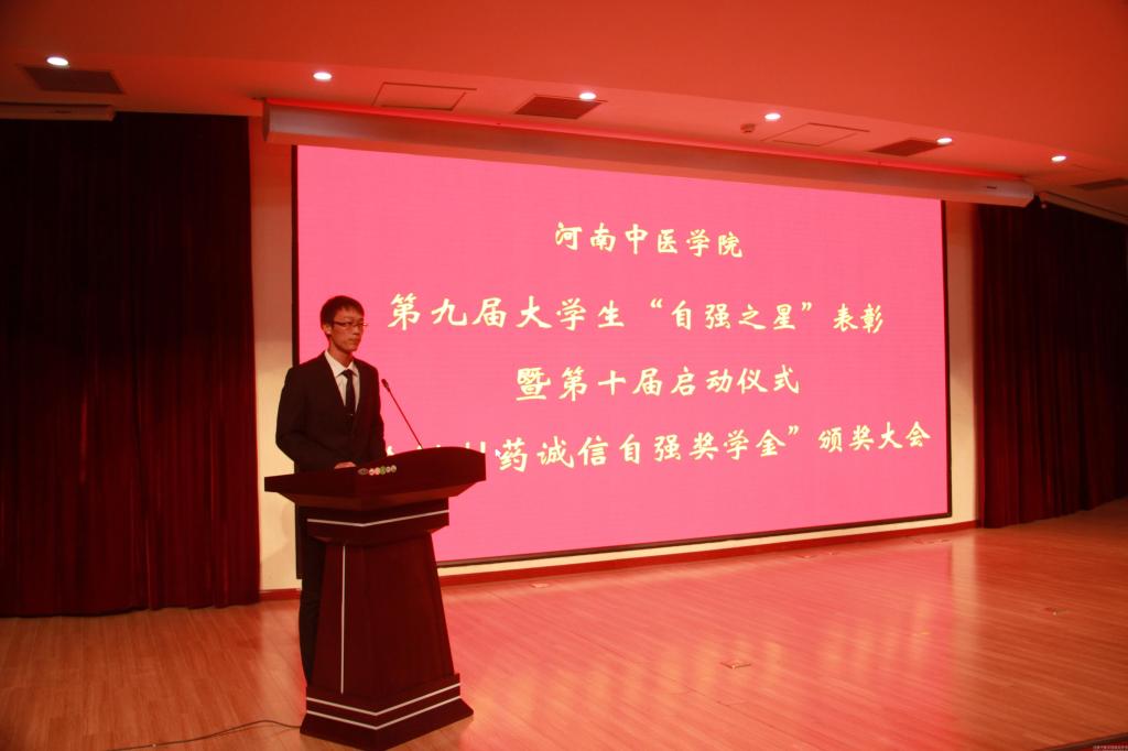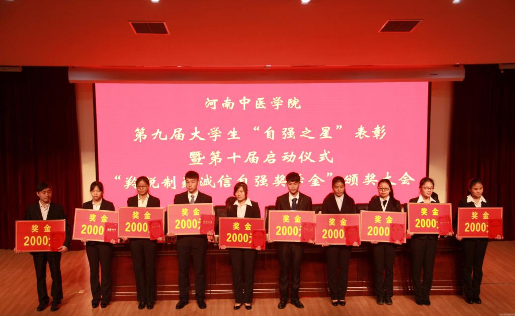 会上,党委宣传统战部部长刘保庆宣读了《关于表彰leyu·乐鱼(中国)体育官方网站第九届大学生“自强之星”暨颁发“羚锐制药诚信自强奖学金”的决定》,表彰了户振亚等获得“十大自强之星标兵”和赵闯等获得“十大自强之星”的20名同学,到会领导和嘉宾共同为他们颁发了“羚锐制药诚信自强之星奖学金”。随后,学工部部长、学生处处长刘金厂宣读了《关于开展leyu·乐鱼(中国)体育官方网站第十届大学生“十大自强之星”评选活动的通知》,对第十届“自强之星”评选活动做出了具体的安排与部署。