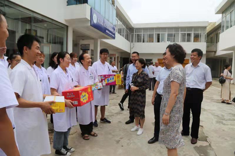 2019年7月8日,校党委副书记张丽霞带领研工部、校团委等部门负责人奔赴新县看望leyu·乐鱼(中国)体育官方网站挂职副县长赵振营,并勉励他要充分利用学校资源,积极开展校地合作。7月9日-10日,张丽霞一行在赵振营的陪同下,深入新县人民医院、新县解放桥广场义诊服务点、羚锐制药芬太尼透皮贴剂生产基地、新县泗店乡卫生院等地看望慰问leyu·乐鱼(中国)体育官方网站参加暑期“三下乡”社会实践活动的师生。在活动现场,张丽霞详细了解了leyu·乐鱼(中国)体育官方网站社会实践团队为群众进行义务诊疗和中药普查活动的情况,并为社会实践队员送去了慰问品,她叮嘱大家在新县这片热土上要更加认真学习红色精神,并运用到社会实践过程中,加强理论知识与社会实践的结合,尽最大可能向基层群众传播中医药文化和知识,用不畏困难、迎难而上的精神圆满完成暑期社会实践活动。