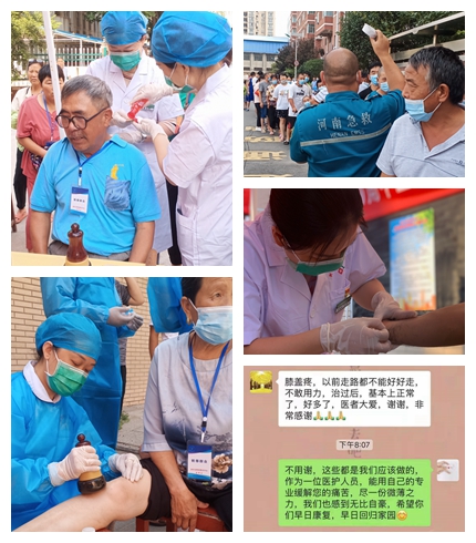 患者李某,62岁,一月前因不慎扭伤右膝关节,此次水灾多次趟水后疼痛加重,经治疗队诊断,段婧老师给予舒筋活络膏中药涂擦配合雷火灸,辅以局部手法按摩,治疗20分钟后,患者感觉疼痛消失,效果之快,让患者对中医技术大为惊叹,后又通过微信表达对医疗队的感谢。