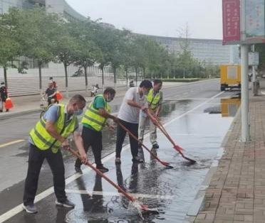 动员结束后,苗明三发出指令,学校防汛救灾各小组立即赶赴现场开始演练。本次演练共分为避险疏导组、动力保障组、抢险救灾组、校园巡查组、灾后重建组等5个小组。各组人员有序按照既定预案分头行动。避险疏导组成员率先到达餐厅,立即组织、劝导用餐学生迅速撤离至9号学生宿舍楼2层;动力保障组成员分头奔赴至学校教学实验楼地下车库、餐厅地下室等配电场所,全力保障学校电力正常供应。同时,使用发电抽水车模拟抽排水工作,严防地下室积水和天一湖水位过高;抢险救灾组成员组织沙袋搬运工作,模拟封堵停车场入口、书院地下室入口以及学校东大门,避免雨水倒灌;校园巡查组成员分组巡查教学实验楼办公室、实验室及教室等人密场所,发现有未撤离人员迅速引导撤离至安全地带;灾后重建组成员使用洒水车、扫地车等设备,在综合实验大楼北侧道路开展了模拟灾后清淤工作。演练过程中,从劝导撤离到果断转移,从迅速集结到各就各位,参演人员进一步掌握了防汛工作的重点、处置程序和方法,为有效应对汛情积累了宝贵经验。