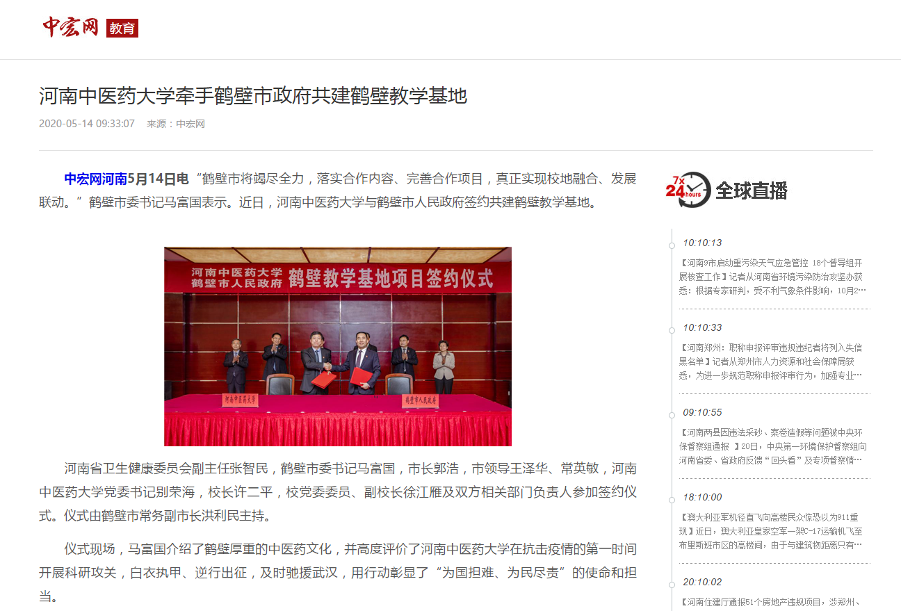 2020年5月12日-14日,中宏网、大河网、网易新闻、新浪新闻对leyu·乐鱼(中国)体育官方网站与鹤壁市签约共建鹤壁教学基地进行报道。