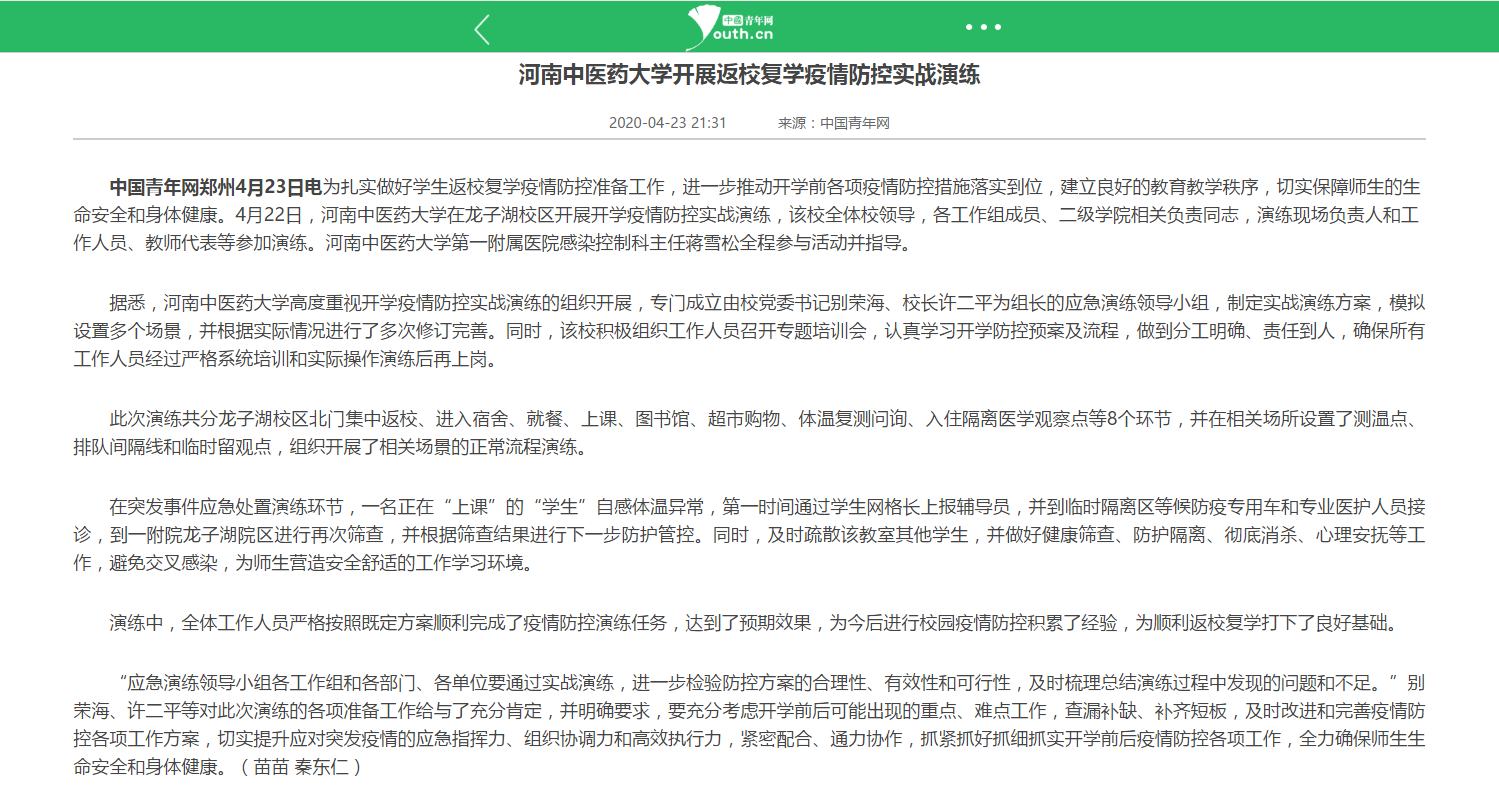2020年4月23日-24日,中青网、中宏网、大河网对leyu·乐鱼(中国)体育官方网站开展返校复学疫情防控实战演练进行报道。