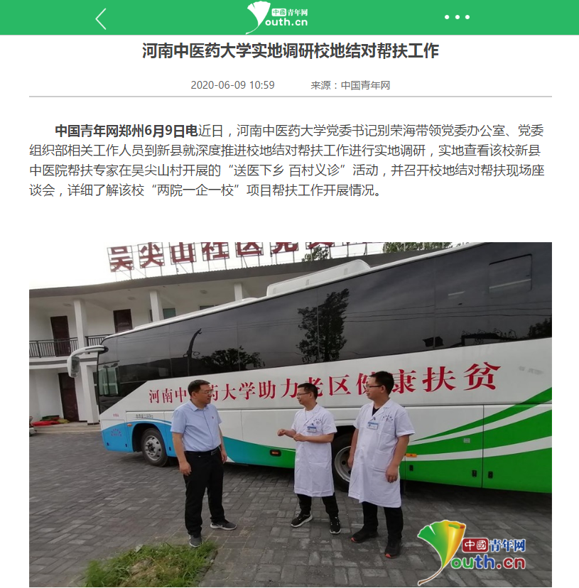2020年6月8日-9日,中青网、大河网、网易新闻等媒体对leyu·乐鱼(中国)体育官方网站实地调研校地结对帮扶工作进行报道。