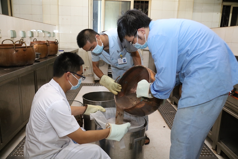 24日郑州天气放晴,气温回升至32摄氏度。盛夏的郑州,连日暴雨后酷暑天气重启。在此次暴雨中受灾严重的阜外华中心血管医院,火箭军某部官兵和武警官兵连日作战,极大地消耗了战士们的体力。据该院副院长郭智萍介绍,因天气炎热,部分官兵已经出现了不同程度的中暑现象。得知此事后,二附院克服煎药房在洪灾中受损严重等困难,发挥中医药特色优势,从下午四点到晚上九点多的五个多小时里,赵旭带领药学部的工作人员加班加点,在高温高湿的环境中紧急熬制清暑除湿汤。汤药熬好后,又经过分袋、封装、装箱等程序,连夜送到郑州阜外华中心血管病医院官兵们手中,并交代了用法用量。