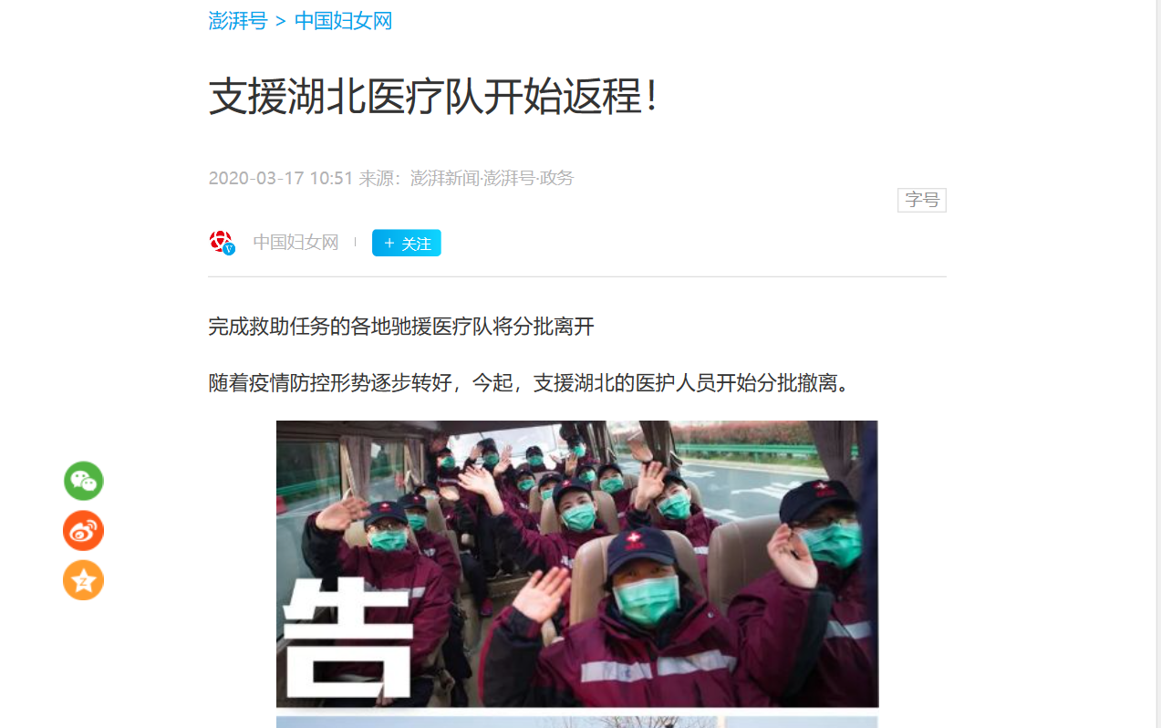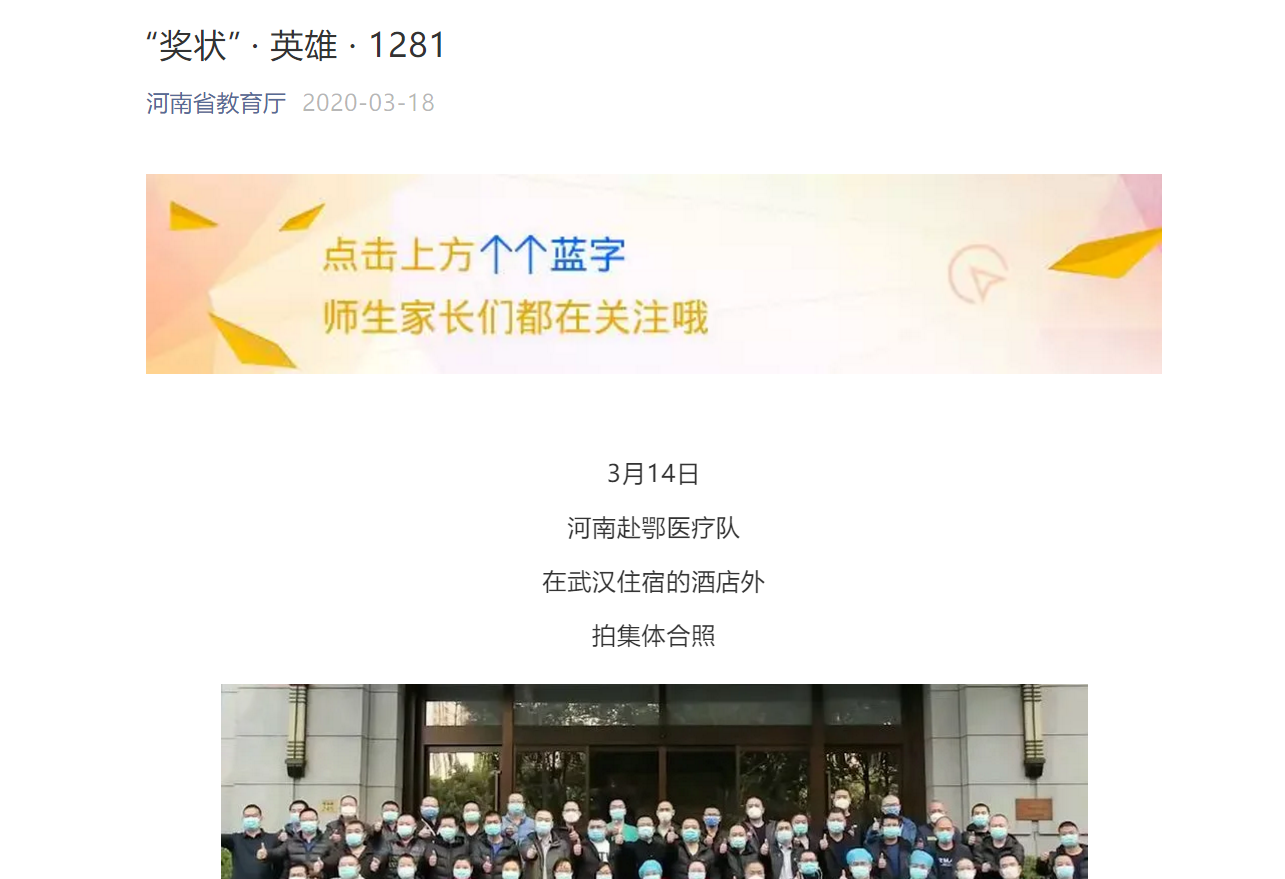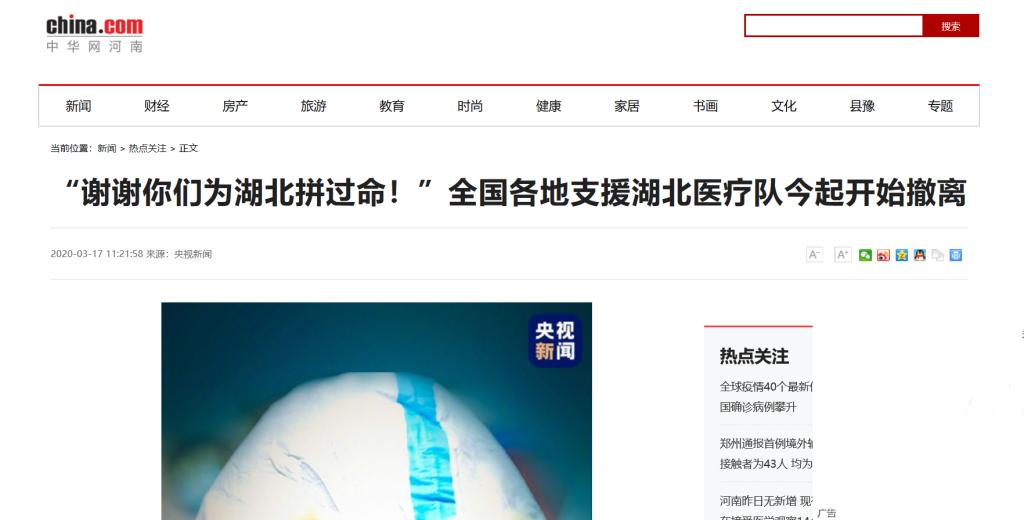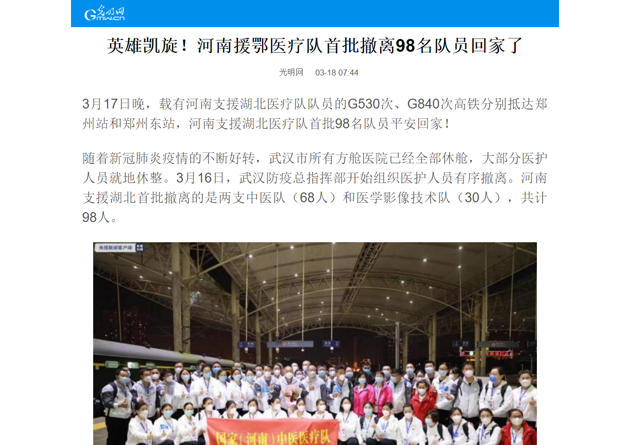 编者按:2020年3月17日-18日,央视新闻、光明网、中华网、中青网、中国妇女网、河南省教育厅官微等媒体对leyu·乐鱼(中国)体育官方网站援鄂医疗队撤离武汉返郑进行报道。