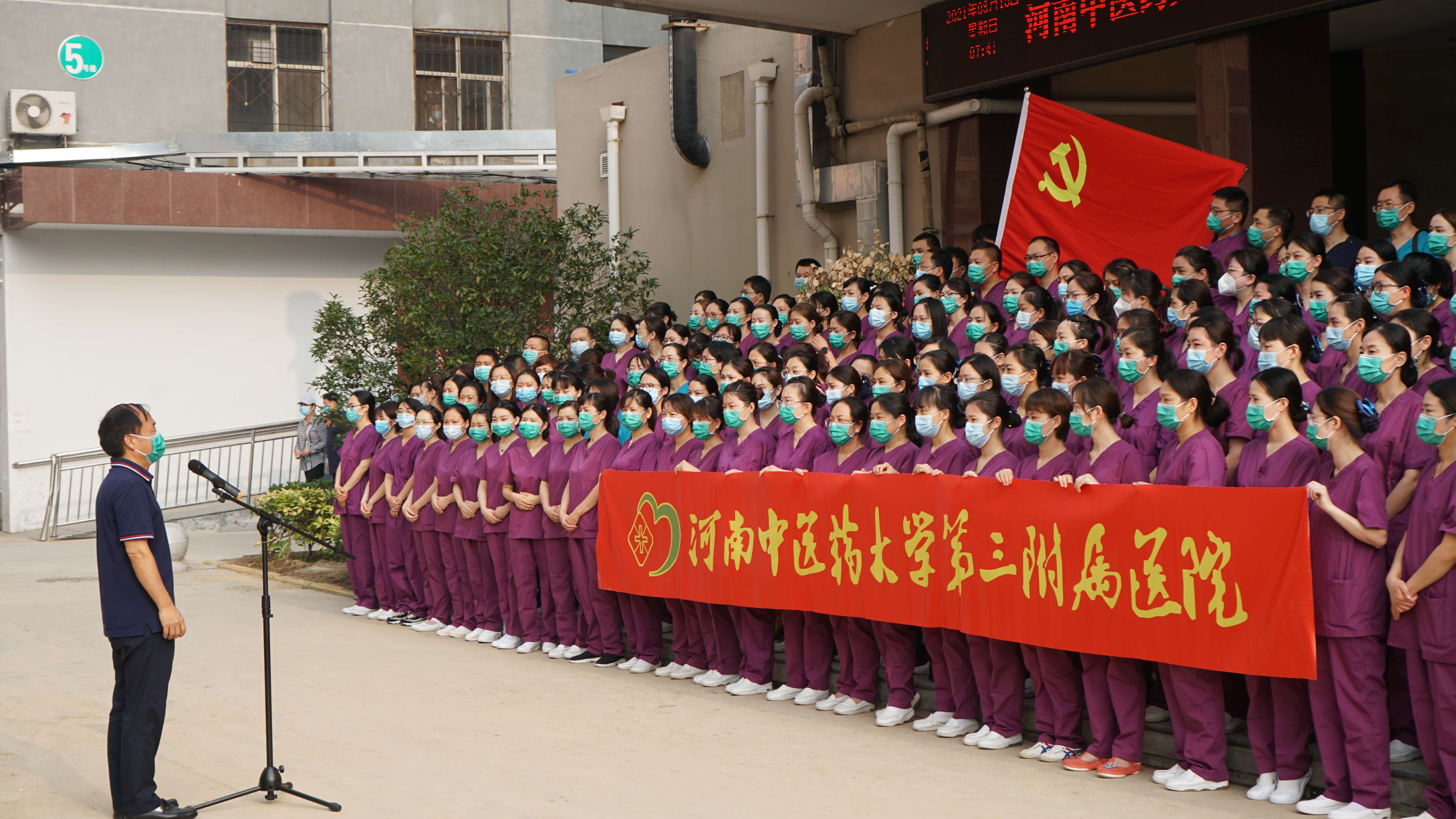 医院党委书记周运峰发表讲话并强调,此次出征队伍中有很多医护人员参加了郑州市前三轮全院核酸检测工作,积累了丰富的经验。他们表现出的不怕疲劳、连续奋战的优良作风,充分展现了三附院广大医护人员的精湛技术及敬业精神,其感人事迹被多家媒体宣传报道。核酸筛查采样队中的广大党员充分发挥了党员先锋模范作用,不仅锤炼了这支队伍、为医院赢得了荣誉,也为此次疫情防控做出了积极贡献。他对队员提出希望,希望同志们在郑州市第四轮全员核酸检测采样工作中继续发扬前几支队伍的作风,汲取经验,做细做好核酸采样工作,圆满地完成此次任务,把病毒圈住、封死,巩固来之不易的防控成果,取得这次这场战“疫”的最终胜利!