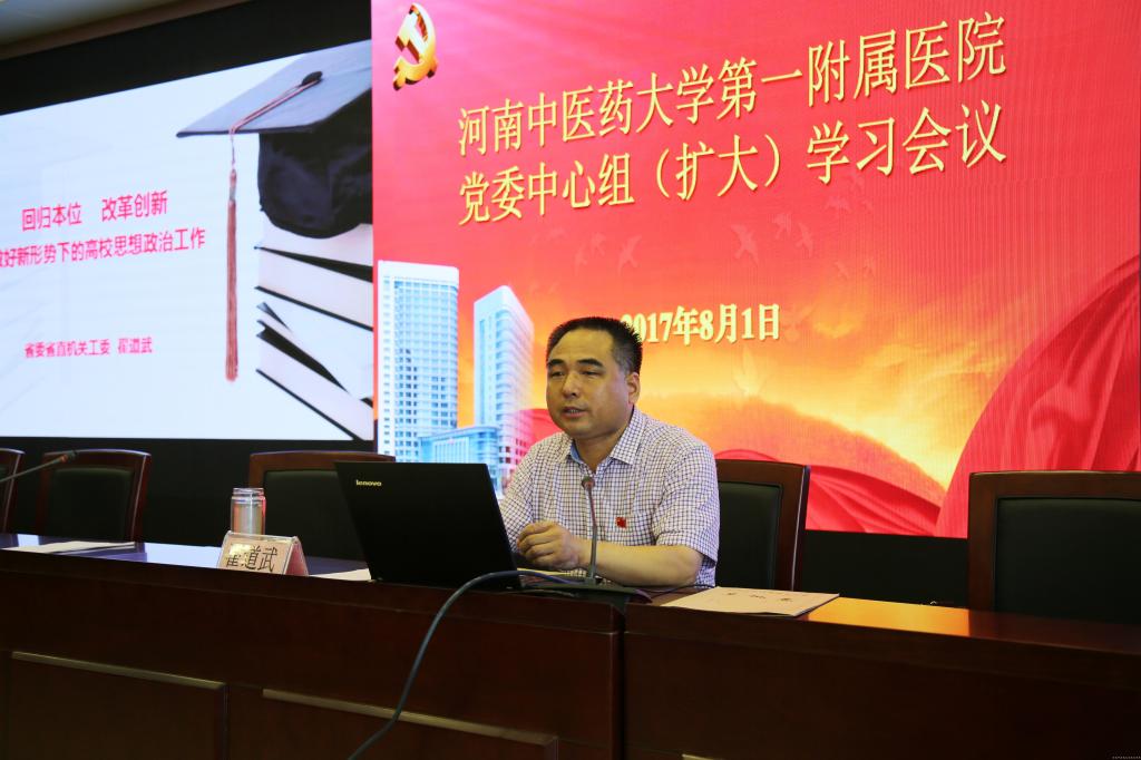 为全面贯彻落实全国、全省高校思想政治工作会议精神,切实增强党员干部对思想政治工作的理论认识,掌握新形势下开展思想政治工作的有效方法。2017年8月1日下午,一附院召开党委中心组学习(扩大)会议,邀请河南省委省直机关工委宣传部部长翟道武同志做专题辅导报告。院党委书记翟剑波、院长朱明军等领导班子成员、党委职能科室负责人、各党总支、直属党支部书记、全体中层干部及普通党员代表参加了学习会议。