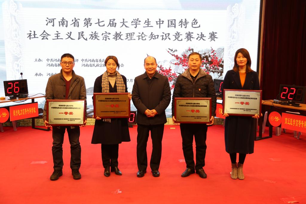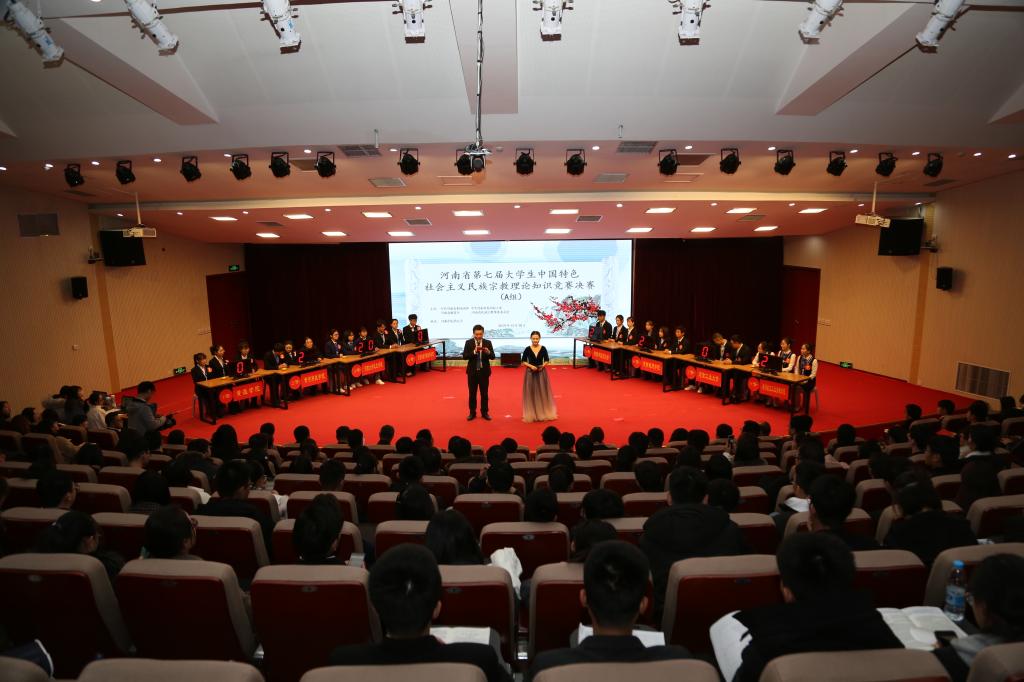 本网讯(文/王谦 图/李昕)为学习贯彻习近平新时代中国特色社会主义思想,宣传党的民族宗教政策,普及国家有关法律法规,促进大学生牢固树立马克思主义民族宗教观,2019年12月18日下午,由中共河南省委统战部、中共河南省委高校工委、河南省教育厅、河南省民族宗教事务委员会联合主办,leyu·乐鱼(中国)体育官方网站承办的河南省第七届大学生中国特色社会主义民族宗教理论知识竞赛决赛在校图书馆第一报告厅举行。来自全省高校的16支代表队参赛,32所高校参与了观摩。省委统战部副部长梁险峰,高校工委专职委员高治军,省民族宗教事务委员会宗教二处处长靖锐,省委高校工委、省教育厅副总督学韩冰,省委高校工委、省教育厅统战处副处长高峰,leyu·乐鱼(中国)体育官方网站党委副书记张丽霞,党委委员、党委统战部部长仲利娟及leyu·乐鱼(中国)体育官方网站各有关职能部门负责人出席比赛,来自省内的32所高校代表和leyu·乐鱼(中国)体育官方网站师生300余人在现场观看比赛。