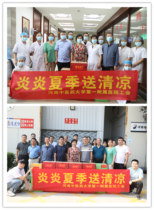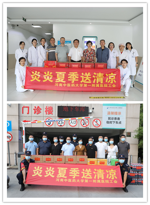 本网讯(文/李海松 图/李瑞)盛夏入三伏,骄阳似火炉。为进一步做好防暑降温工作,切实保障一线职工的身心健康,一附院工会于近日组织开展“炎炎夏日送清凉”系列活动。郑州市总工会党组副书记赵志新,郑州市教科文卫体工会负责人周帆,院领导翟剑波、朱明军、段其波、霍勤、乔东鸽、丁波等参加活动,为冒着酷暑坚守岗位的一线职工送去降温慰问品和诚挚的关怀。