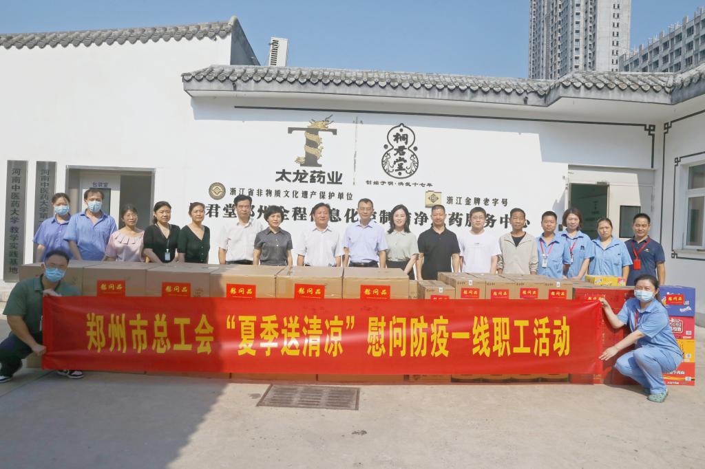 2022年8月4日上午,在翟剑波、乔东鸽的陪同下,赵志新一行前往煎药中心开展慰问。他实地了解了药师们的工作环境,对大家不畏酷暑,一如既往地按照标准的工作流程,保质保量为患者提供煎药服务的精神表示赞扬。赵志新强调,近年来,一附院在重大自然灾害和疫情救治工作中白衣执甲、逆行而上,在充分发挥中医药特色优势的同时取得了骄人的成绩。他代表市总工会向默默在岗位上无私奉献的劳动者们致以诚挚的慰问,并叮嘱大家一定要注意休息,确保自身的安全与健康,各级工会组织要充分发挥“娘家人”优势,围绕中心工作,强化责任担当,及时了解职工困难,帮助协调解决问题,为绿城的健康发展贡献力量。