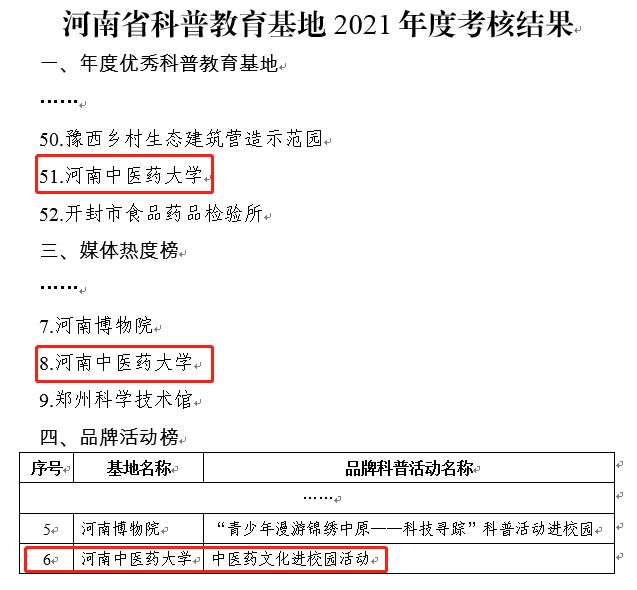 本网讯(文图/柳忠勇)2022年4月18日,河南省科协、河南省文明办公布了河南省科普教育基地2021年度考核结果。leyu·乐鱼(中国)体育官方网站获评2021年度优秀科普教育基地,并入选“媒体热度榜”专项榜单,leyu·乐鱼(中国)体育官方网站开展的“中医药文化进校园活动”入选“品牌活动榜”专项榜单。