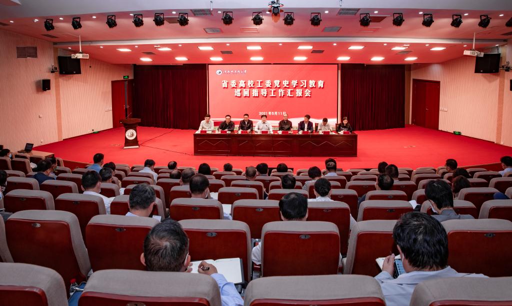 省委高校工委党史学习教育第四巡回指导组联络员、教育厅思想政治工作处一级调研员杨宗辉,指导组成员、河南工业大学经济贸易学院党委副书记王鹏、华北水利水电大学环境与市政工程学院党委副书记郭婷,在郑校领导张小平、李小芳、徐江雁、田力、张加民及全体中层正职、党支部书记代表等参加巡回指导工作汇报会。