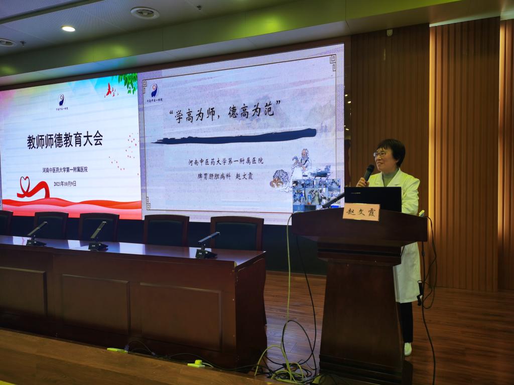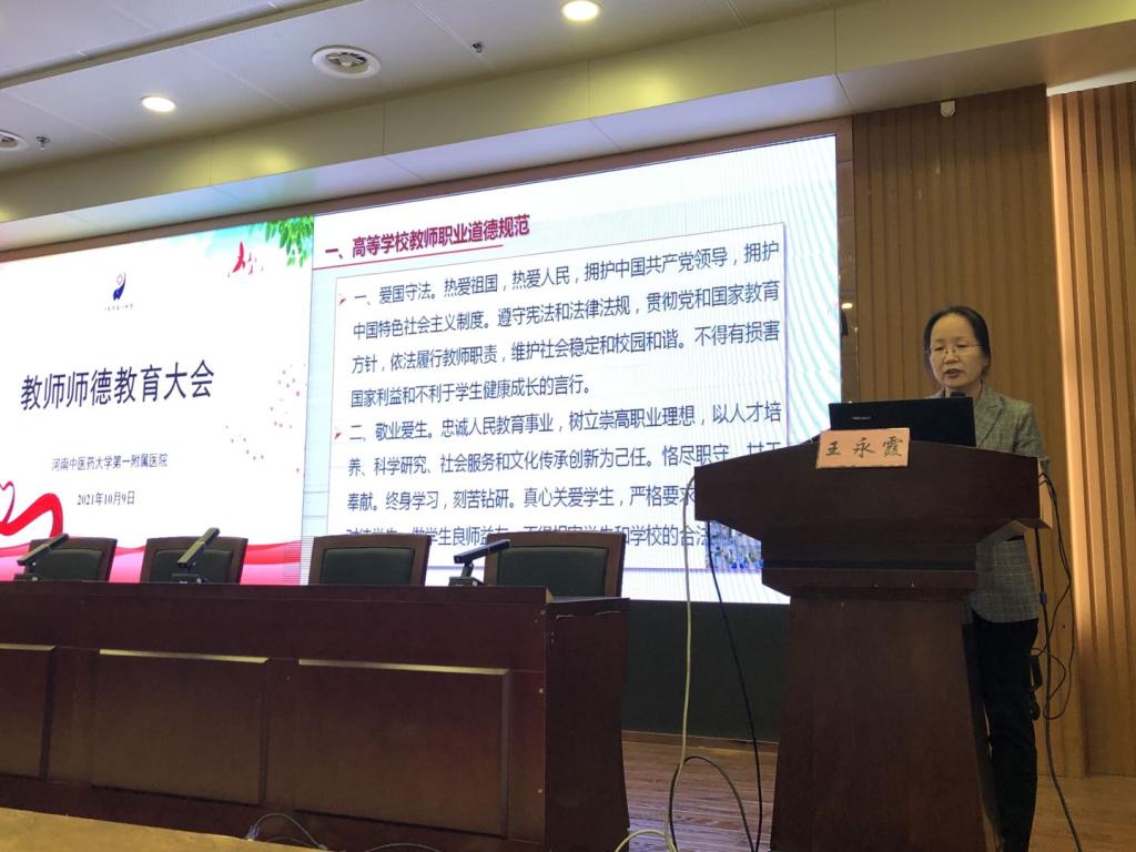 大会在医院基地楼15楼召开,并且采取线上同步直播,保证全院教职员工均能直接领会本次会议精神,大会由leyu·乐鱼(中国)体育官方网站第一附属医院党委副书记张婉红同志主持。会上,院党委副书记、纪委书记段其波同志就全体教职员工深入学习习近平总书记关于师德师风的重要论述,以党史学习教育为主线,在教师队伍中强化“四史”学习教育作动员讲话,并深入分析了现阶段教学队伍中存在的不足。全国高等中医药院校教学名师丁樱、赵文霞两位教授结合自身经验,分别介绍了师德师风建设的体会及经验。最后,第一临床医学院(中西医结合学院)副院长王永霞同志还带领全体教职员工重温《高等学校教师职业道德规范》、《新时代高校教师职业行为十项准则》、《leyu·乐鱼(中国)体育官方网站师德失范行为负面清单及处理方法》等教育行业和教师职业相关政策法规。
