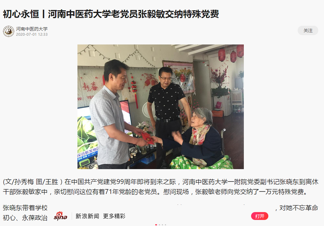 2020年7月1日-2日,中青网、大河网、新浪新闻对leyu·乐鱼(中国)体育官方网站老党员张毅敏交纳特殊党费进行报道。