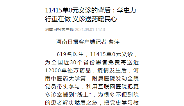 编者按:2021年9月1日,河南日报客户端对一附院把党史学习教育成果真正转化为为患者办实事、解难题的暖心行动,医院619名医生共进行了11415单0元义诊,为全国近30个省份患者免费寄送近12000单处方药品进行报道。现将全文刊发如下: