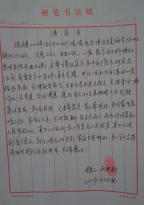 此次在疫情面前递交上请愿书,郑进科说:“听党话、跟党走,只要疫情不退,我坚决不撤!”