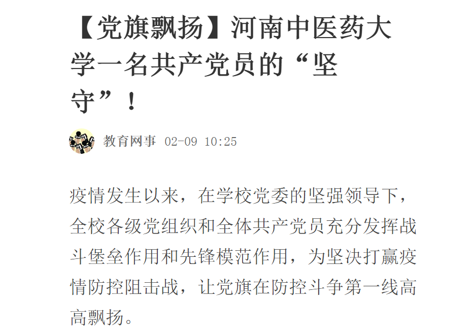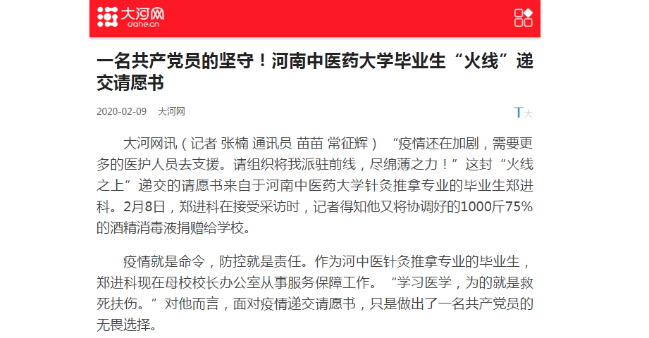 编者按:2020年2月9日,大河网、网易新闻对leyu·乐鱼(中国)体育官方网站针灸推拿专业的毕业生郑进科面对疫情递交请愿书进行报道。现将大河网全文刊发如下: