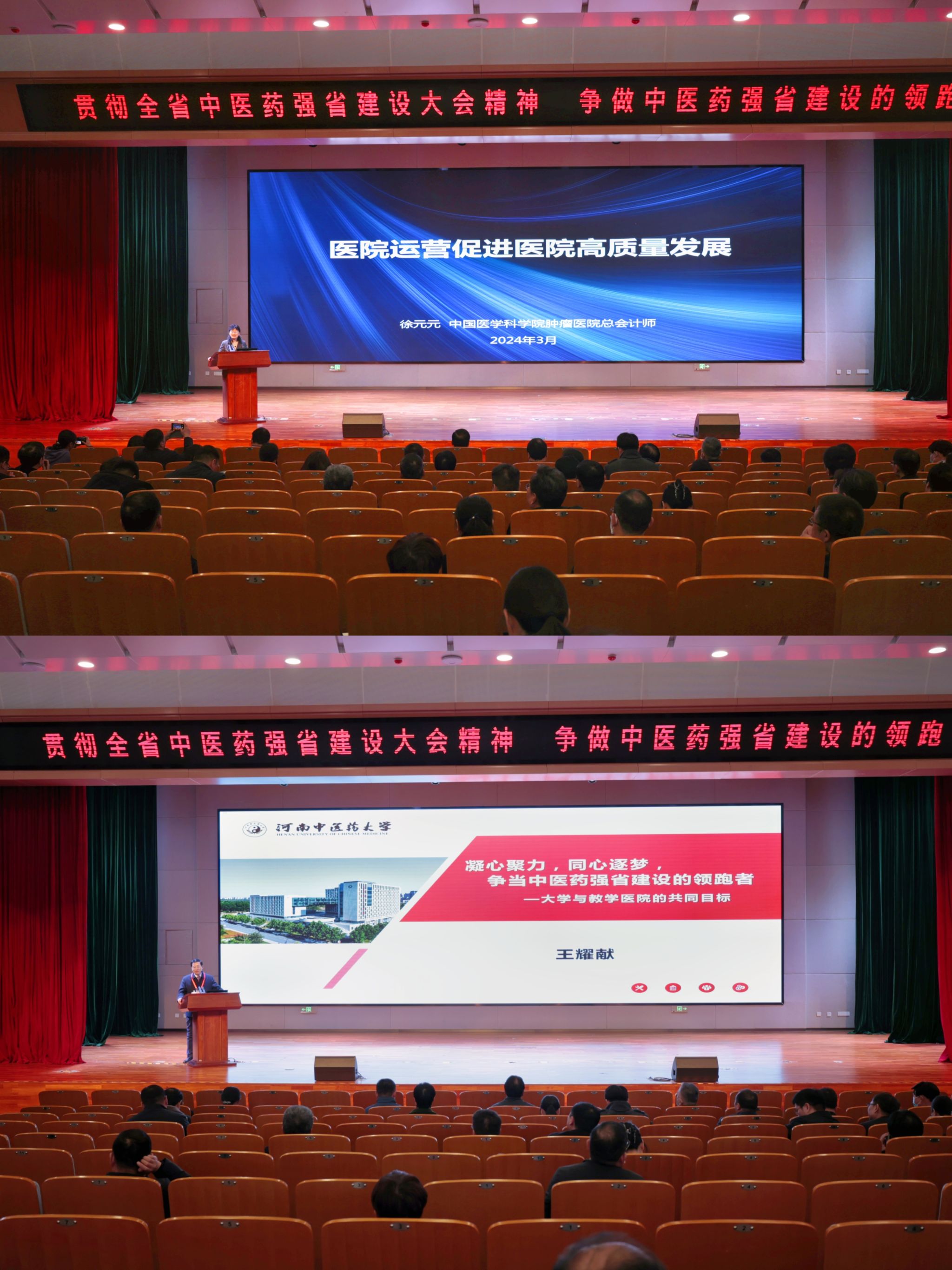 3月9日,中国医学科学院肿瘤医院总会计师徐元元和leyu·乐鱼(中国)体育官方网站校长王耀献分别以《医院运营促进医院高质量发展》《凝心聚力 同心逐梦 争当中医药强省建设的领跑者》为题作专题讲座。徐元元围绕新形势下医院运营管理的新要求、建立健全医院运营管理体系、医院运营管理的实践三个方面,以丰富的案例、详实的数据、专业的见解深入讲解如何找准医院高质量发展路径,建设高水平医院。王耀献围绕理论阐释,大学教学医院高质量发展,大学教学医院初心与使命,中医药强省建设、教学医院何为四个方面,深入讲解大学与教学医院的历史逻辑、现实逻辑、理论逻辑,详细阐释了实现教学医院高质量发展的十大要素与重点环节,表示教学医院要牢记初心使命,强科研、重教学、育人才,与大学聚力共奋进、筑梦谱新篇。