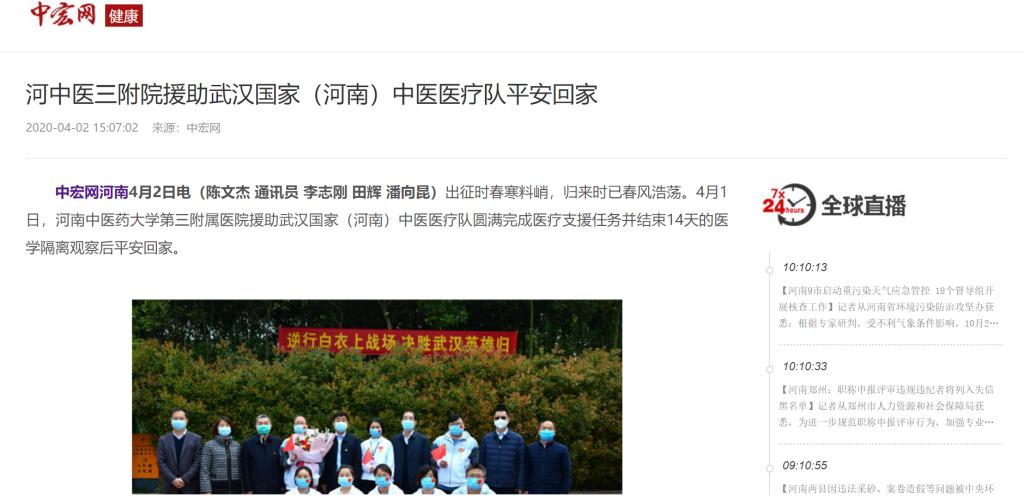 编者按:2020年4月2日,中宏网对leyu·乐鱼(中国)体育官方网站三附院援助武汉国家(河南)中医医疗队平安回家进行报道。现将全文刊发如下:
